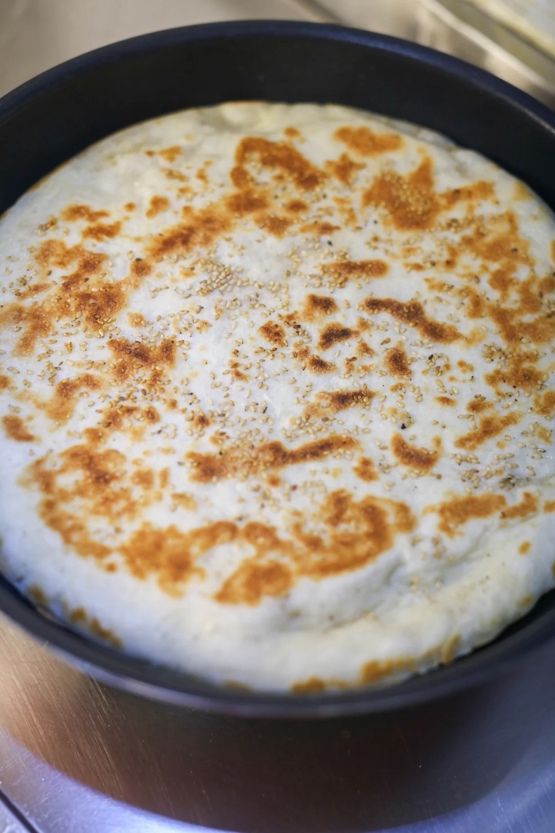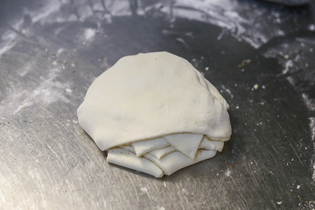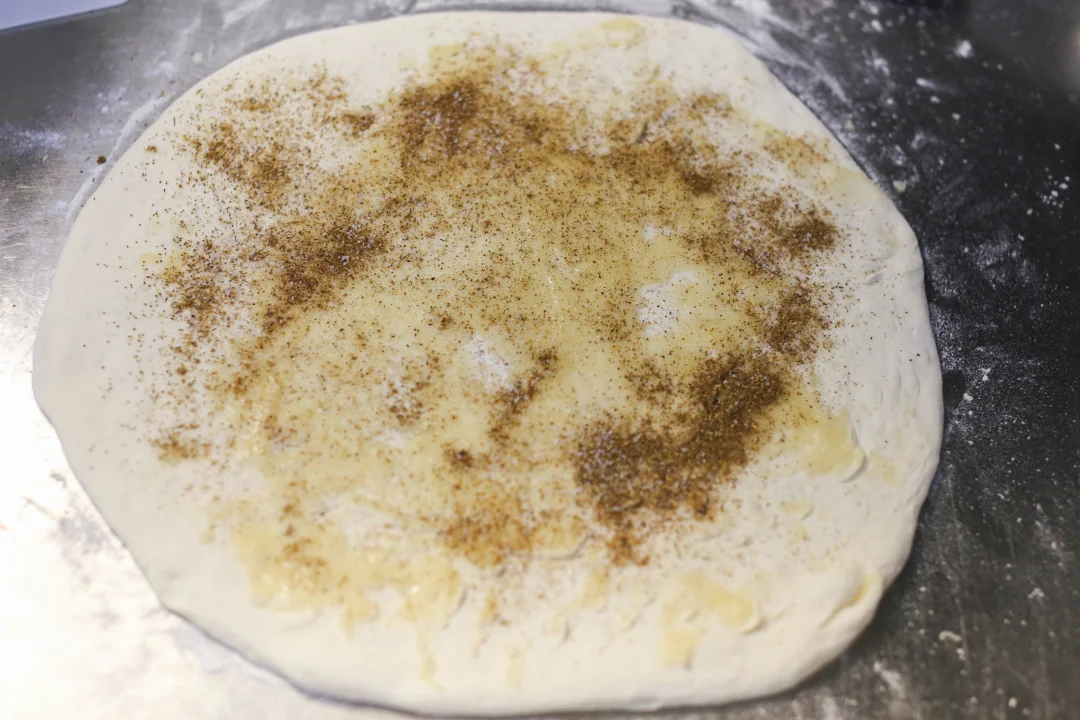 面团发酵到6-7成热,擀成一个半公分厚的大圆饼,抹上油酥,撒上椒盐。