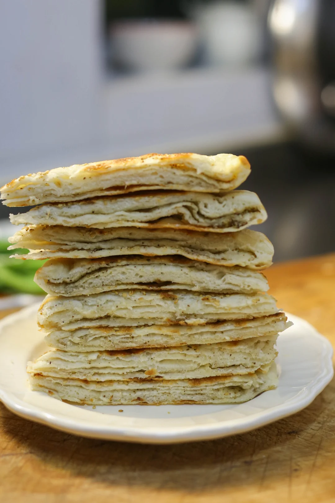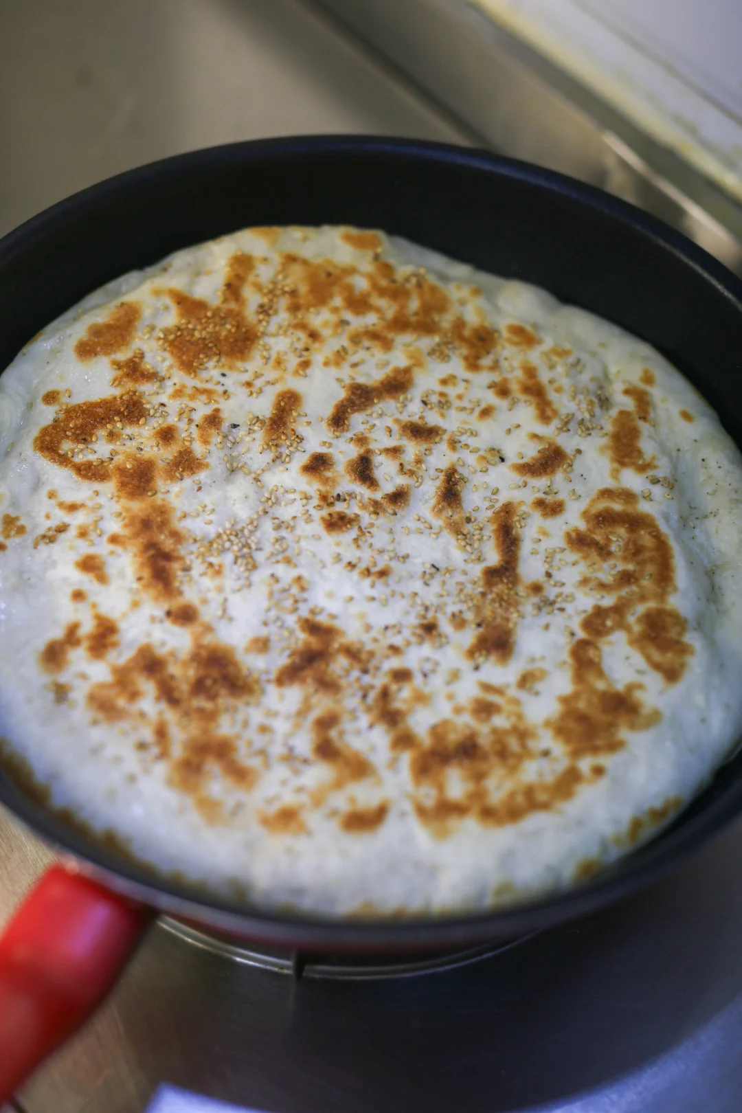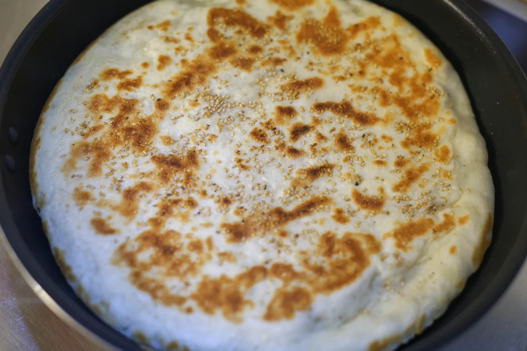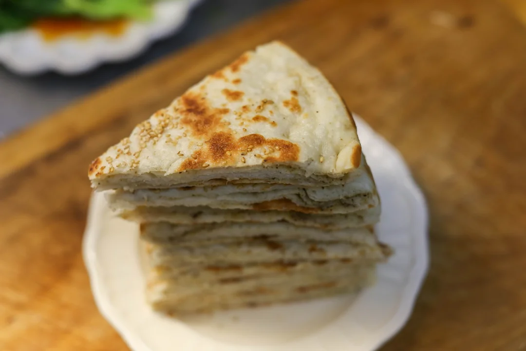 弄千层饼的方法有很多种,我最常用的就是在半径1/2处切一刀,然后从上到下或者从下到上圈起来,饧10分钟,表皮洒上水,放上芝麻,烙至两面金黄即可。