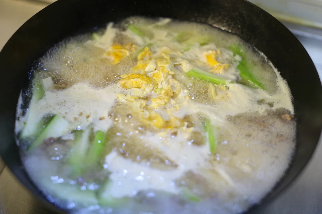 做法就和图片的顺序一样了~ 肉沫提前用你喜欢的调味腌制一下,鸡蛋提前炒好,后面根据口味添盐和鸡粉,所有煮熟即可。