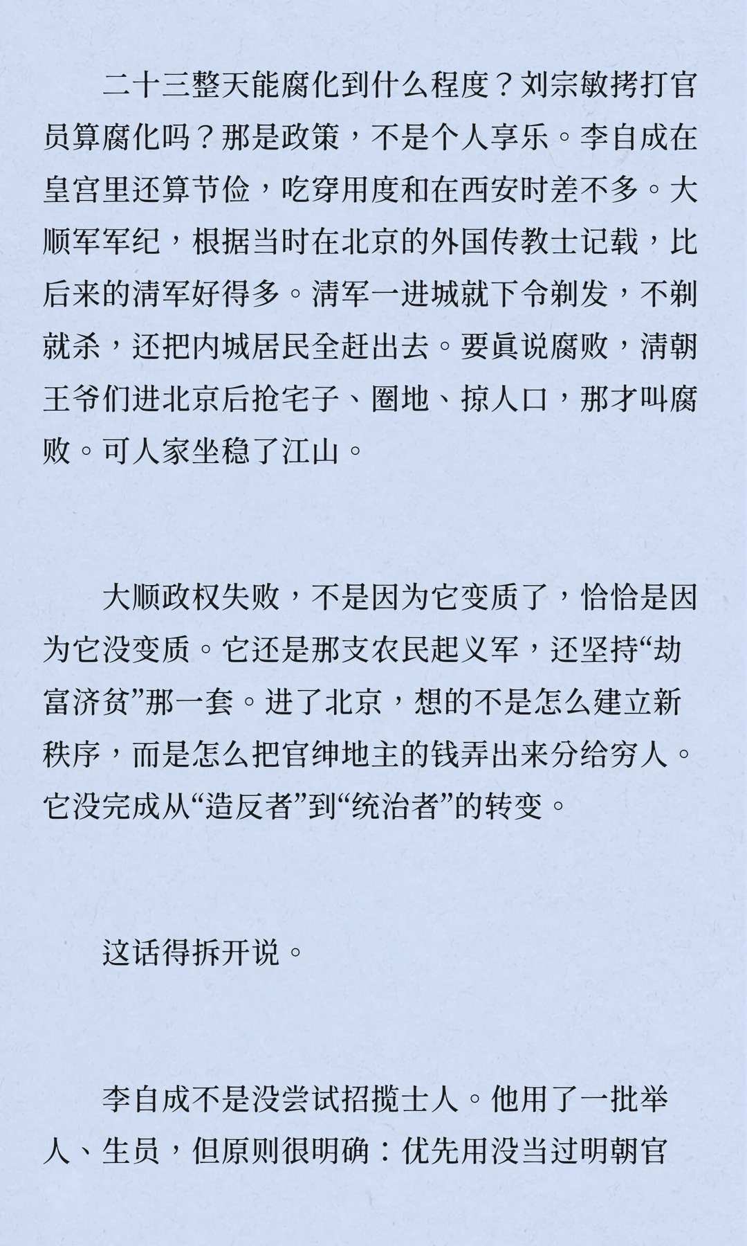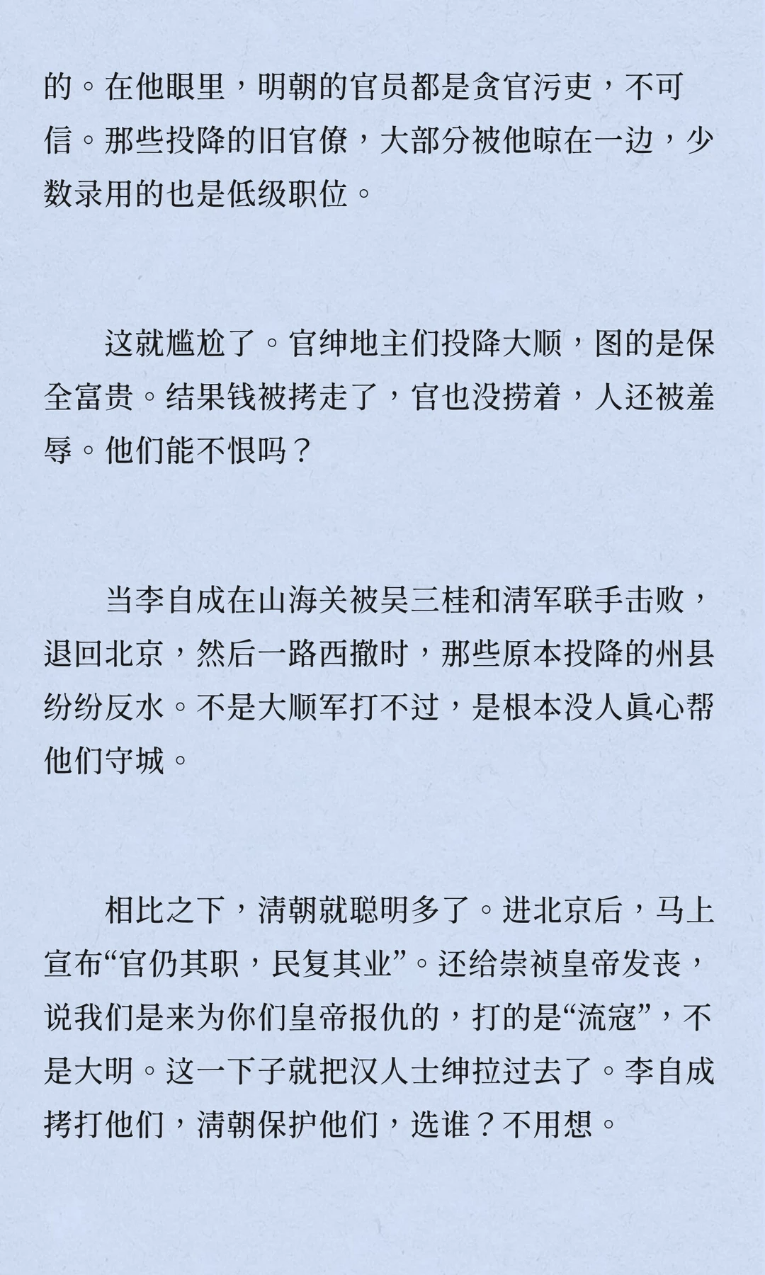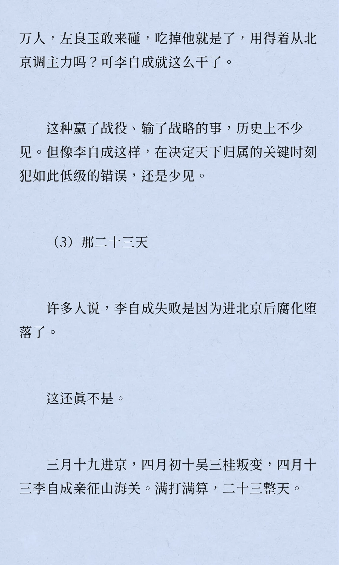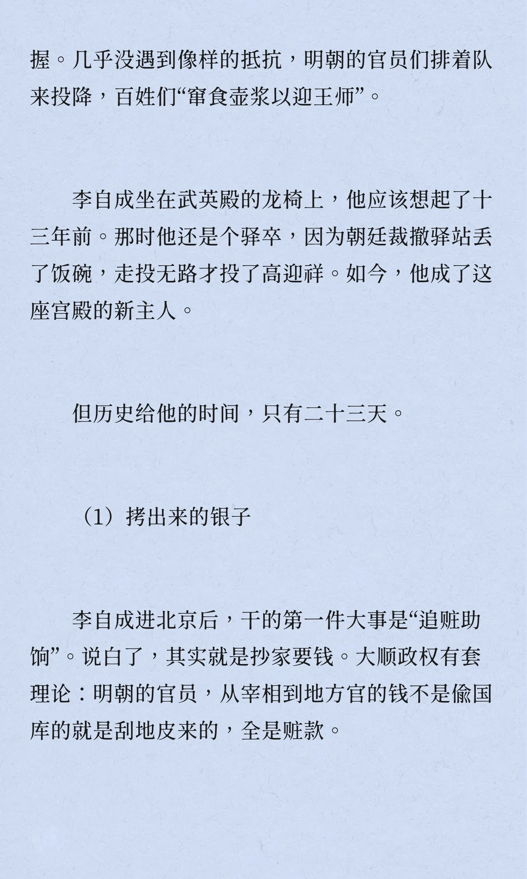 李自成率大顺军入京,迅速控制北京,却因“追赃助饷”政策激化矛盾,人心离散。军事部署失误,未重视清军威胁,导致山海关失守。大顺政权仅存在二十三天,迅速瓦解,未能改变历史走向。