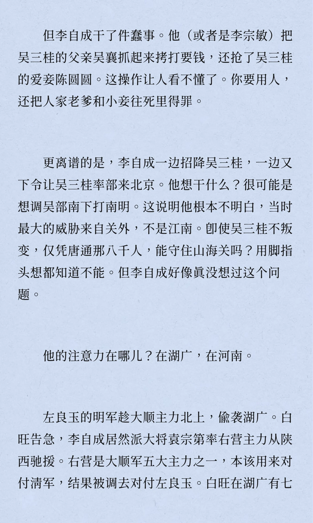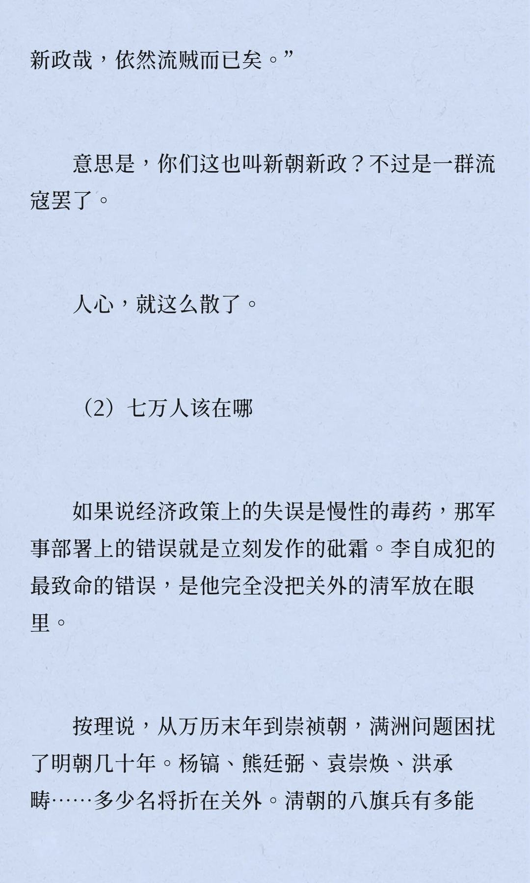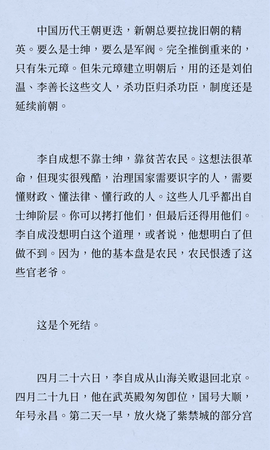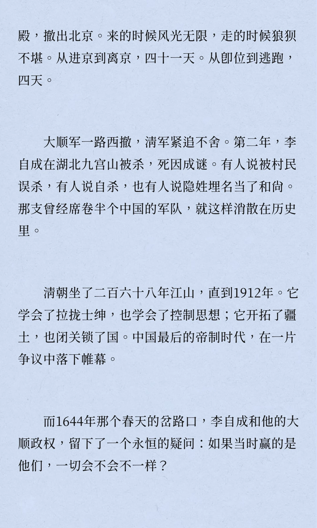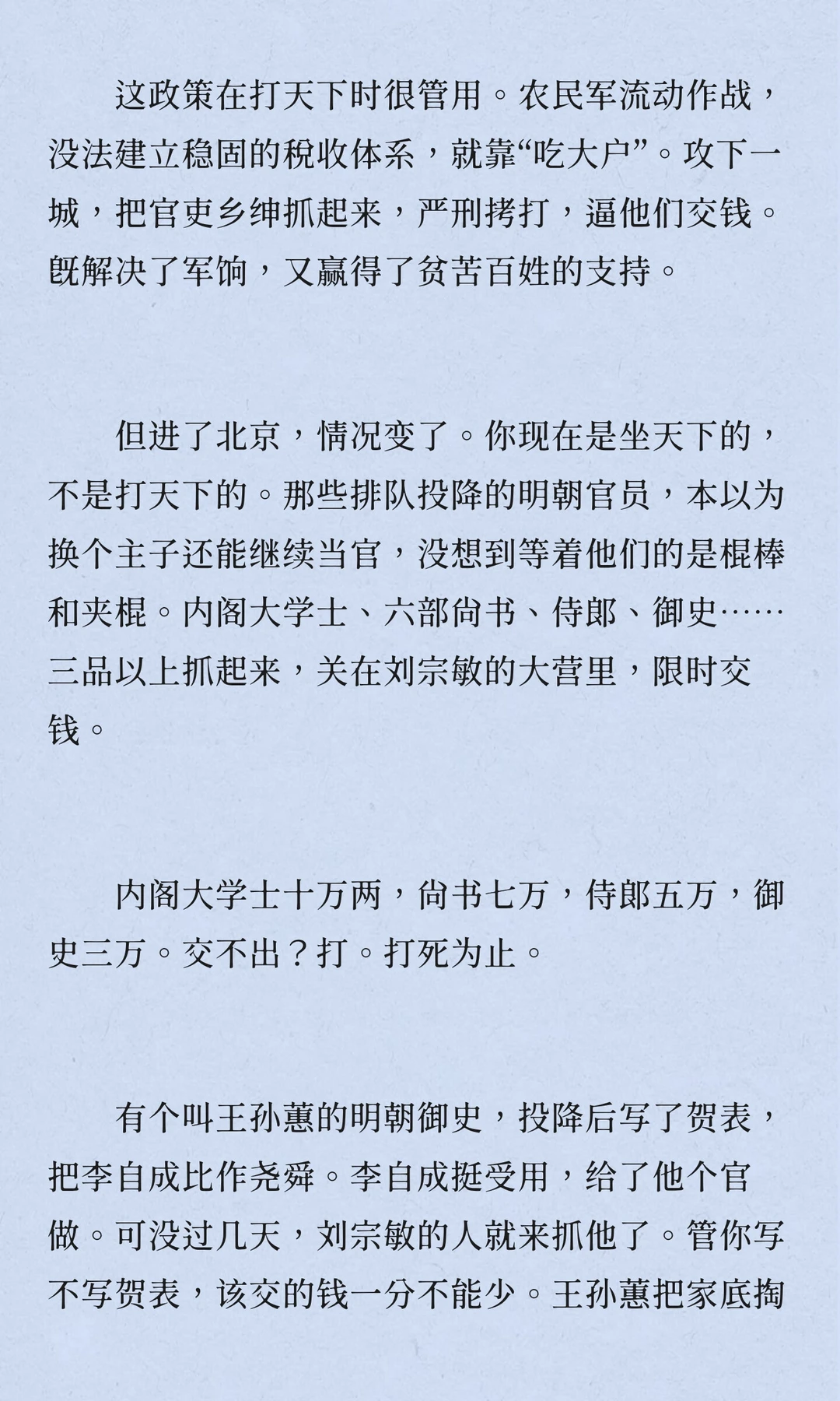 李自成率大顺军入京,迅速控制北京,却因“追赃助饷”政策激化矛盾,人心离散。军事部署失误,未重视清军威胁,导致山海关失守。大顺政权仅存在二十三天,迅速瓦解,未能改变历史走向。