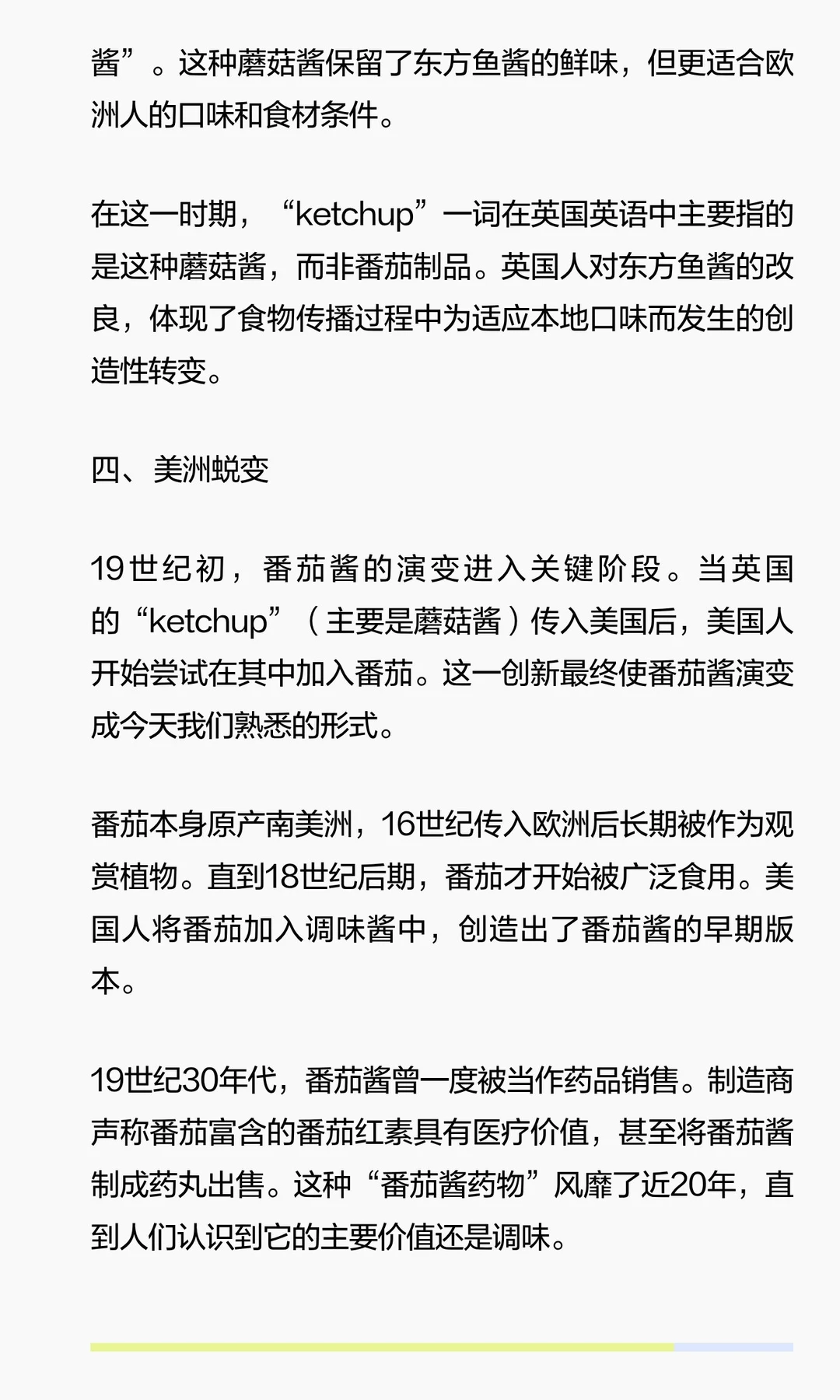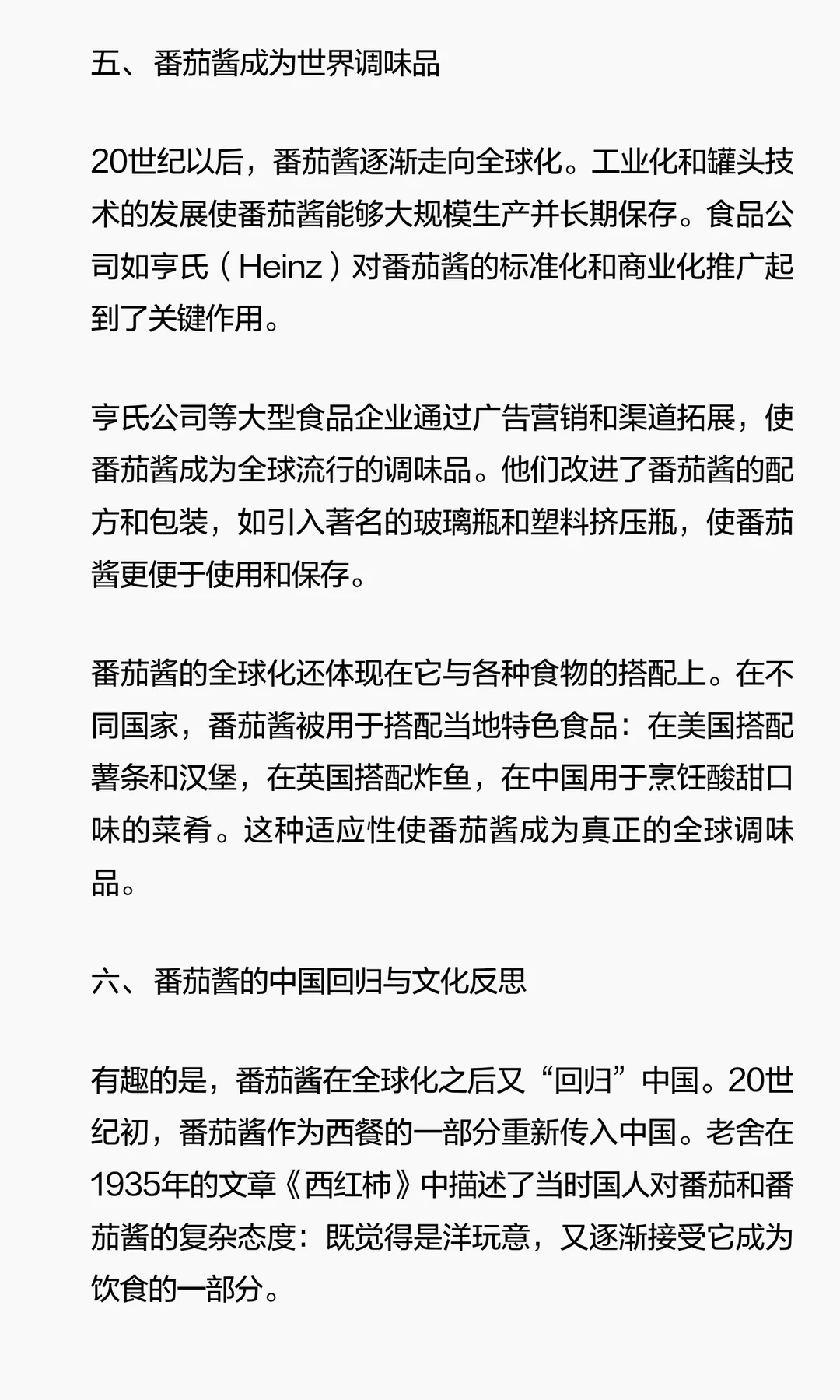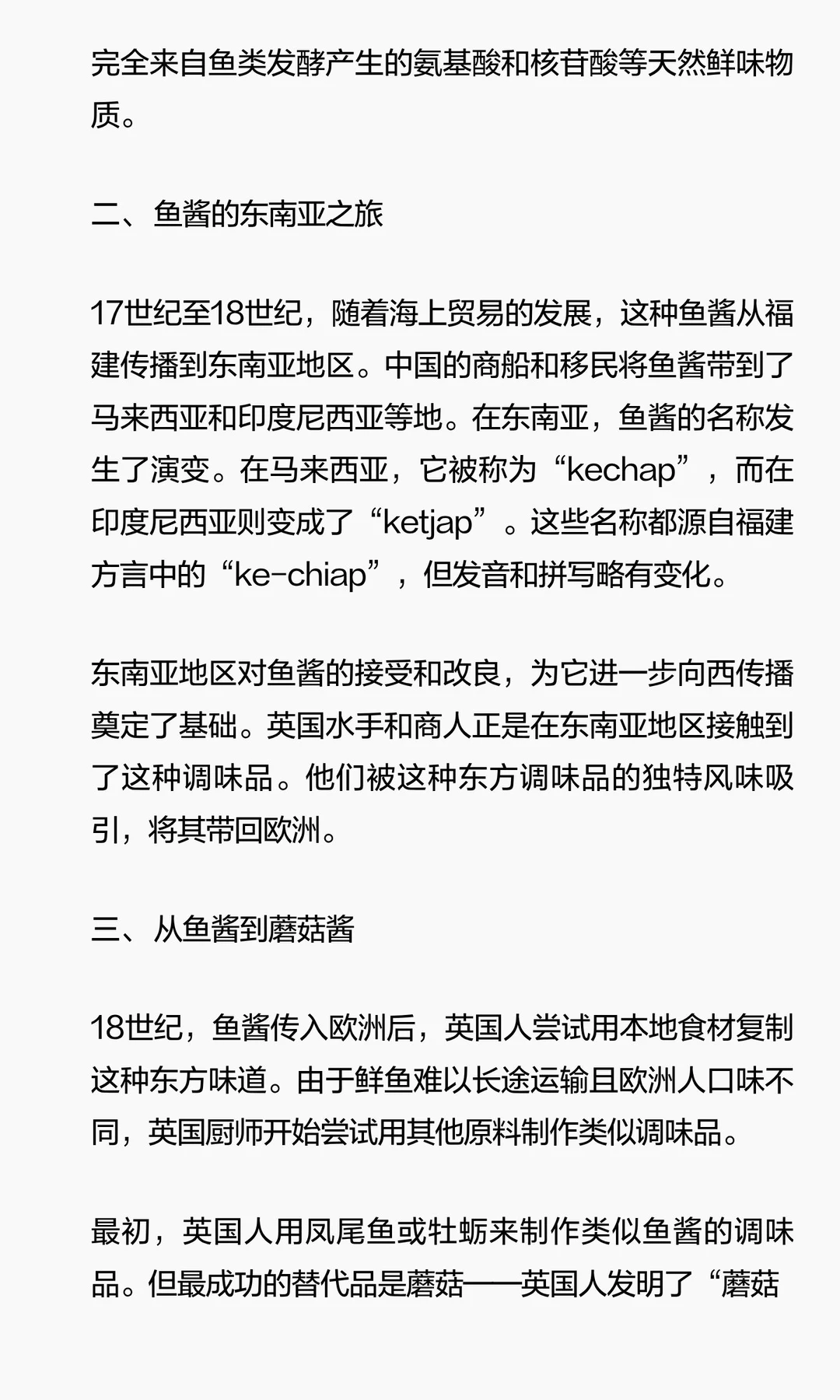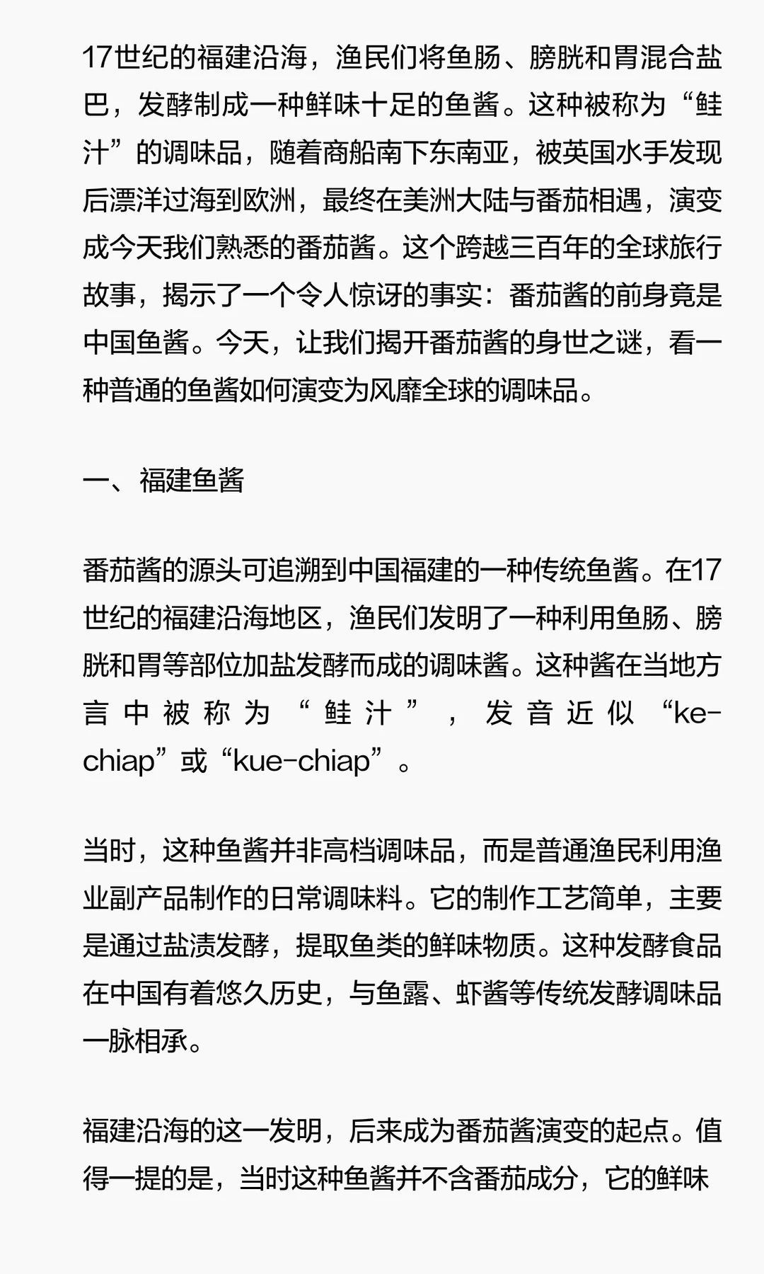 福建渔民制作的鱼酱在17世纪传入东南亚,英国水手将其带回欧洲,改良为蘑菇酱。19世纪,美国人加入番茄,创造番茄酱。番茄酱通过工业化和全球化成为全球调味品,甚至在中国重新流行。