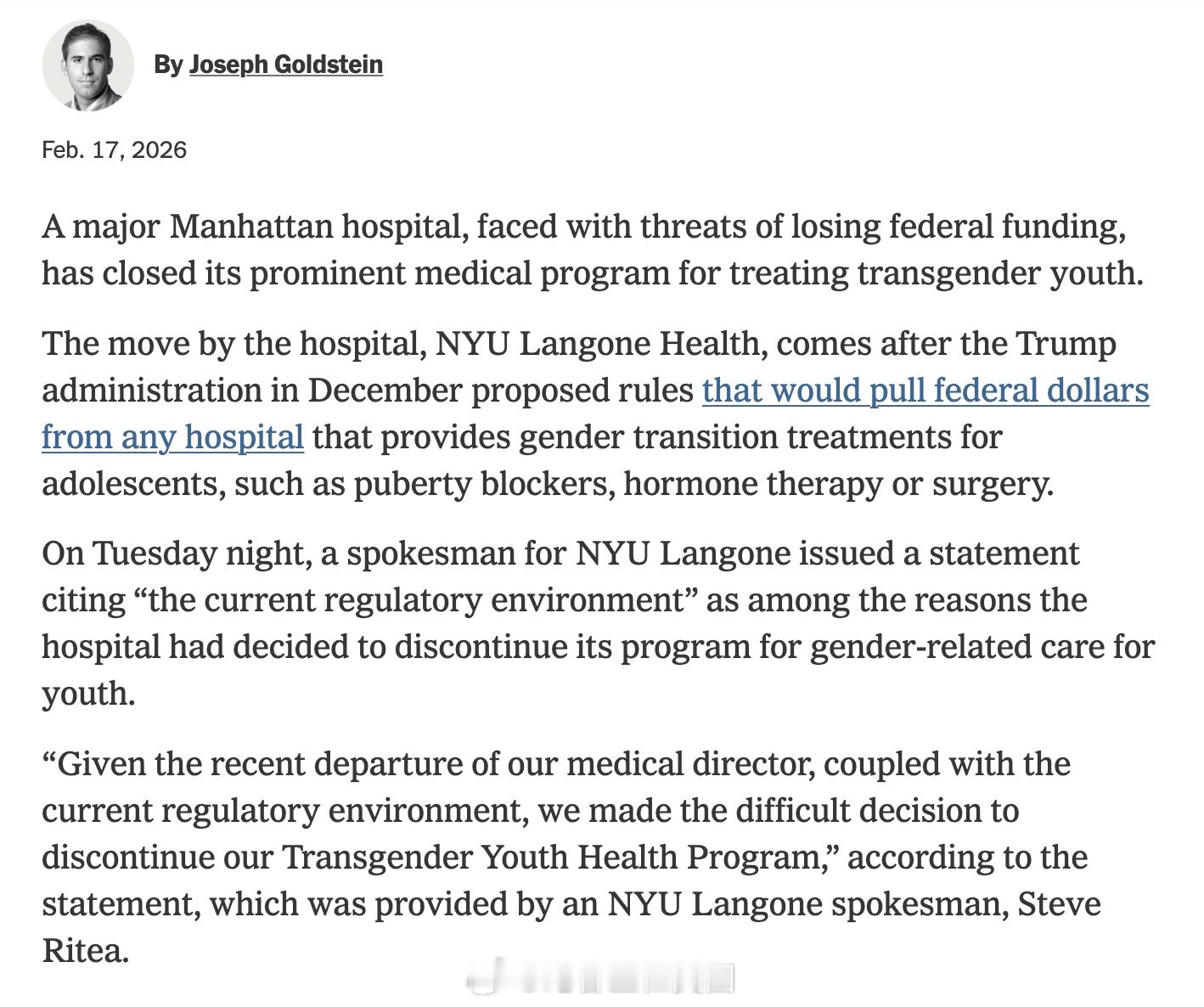 纽约的NYU Langone Health因川普政府提出的新规,面临可能失去联邦资金的压力,决定关闭其跨性别青少年医疗项目。声明称,医疗主任离职及“当前监管环境”是做出此决定的主要原因,医院将不再为未成年人提供性别转换相关治疗。