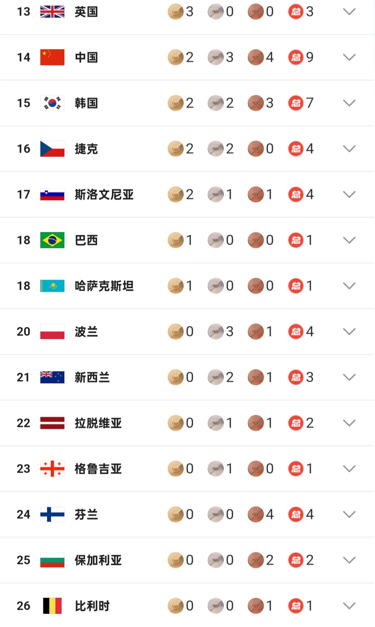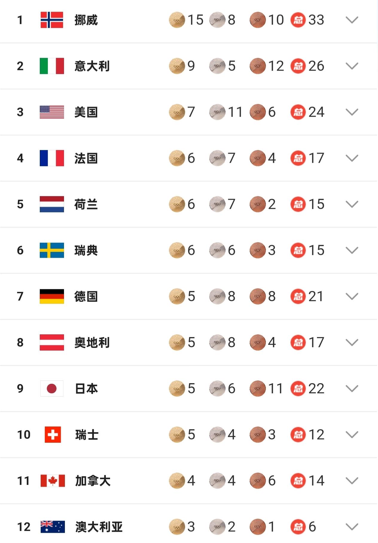 米兰冬奥会最新金牌榜! 中国队两金升至第14,36岁的徐梦桃创造历史。 挪威15枚金牌遥遥领先! 北京时间2月19日,米兰冬奥会火热进行。 ①单板滑雪男子坡面障碍技巧决赛——中国选手苏翊鸣加冕冠军,为中国队夺得本届冬奥会的首金,这是非常重要的时刻。这位22岁的小将发挥简直完美,第一跳82.41分奠定优势,随后依旧保持出色的竞技水准,第三跳又是超过82分,最终没人能够超越,赛后他格外激动,站上最高领奖台的那一刻喜极而泣。 ②自由式滑雪女子空中技巧决赛——中国选手徐梦桃强势夺金,成为该项目第一位卫冕的女运动员。五届冬奥会,36岁的老将是充满自信,赛前表示没有任何包袱,已经做足准备,果然也拿出最佳状态,用完美的表现征服所有人,赛后直言自己就是这个项目的历史最佳,真的太霸气。另一位中国选手邵琪同样发挥优异,获得一枚铜牌。 毫无疑问中国队在本比赛日是收获满满,不仅实现金牌零的突破,更是短短数小时连夺两金,极其振奋人心的时刻,期待在剩余赛程能有更好的发挥。