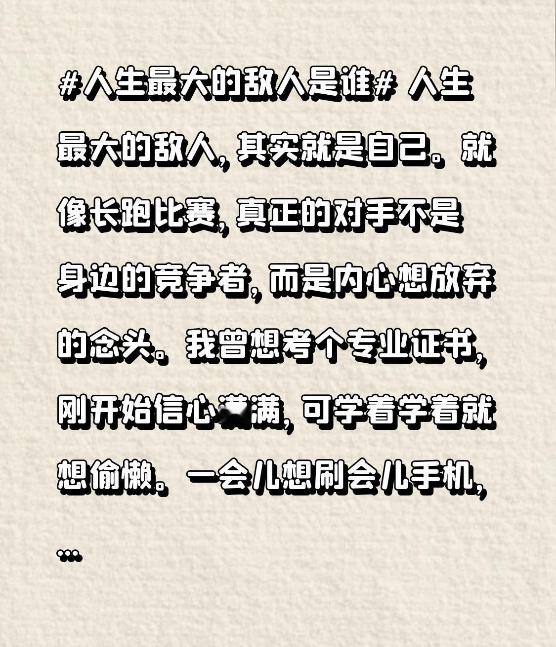 人生最大的敌人,其实就是自己。就像长跑比赛,真正的对手不是身边的竞争者,而是内心想放弃的念头。我曾想考个专业证书,刚开始信心满满,可学着学着就想偷懒。一会儿想刷会儿手机,一会儿又觉得太难想放弃。每次克服这些想法,学习就有进步;要是被它们打败,就又停滞不前。最终,我逼自己克服内心的懒惰和畏难,才拿下证书。和自己的较量,贯穿人生每一步,战胜自己,才能不断前行。