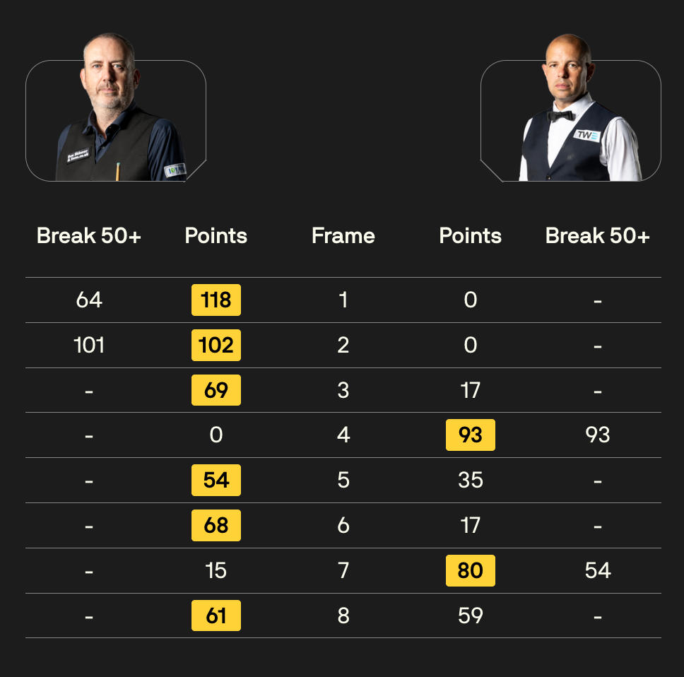 全场比赛,威廉姆斯打出单杆64、101分,霍金斯打出单杆93、54分。
