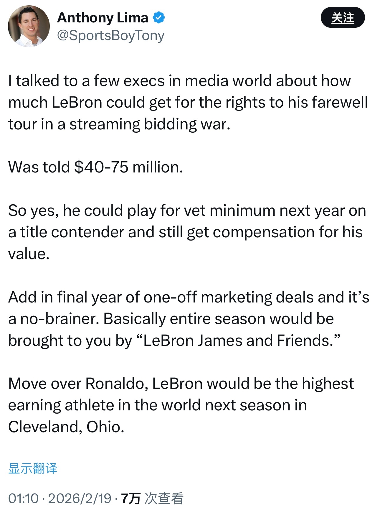 我和几位传媒界高管聊了聊,勒布朗的退役巡演转播权在流媒体竞价大战中,他能拿到多少钱。得到的消息是:4000万到7500万美元。