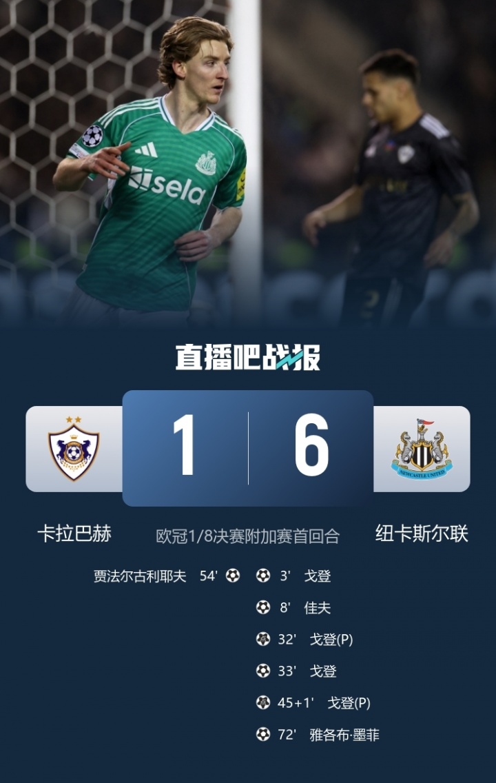 直播吧02月19日讯欧冠1/8决赛附加赛首回合,纽卡客场6-1大胜阿塞拜疆球队卡拉巴赫,一只脚已经踏入欧冠精英联赛16强。