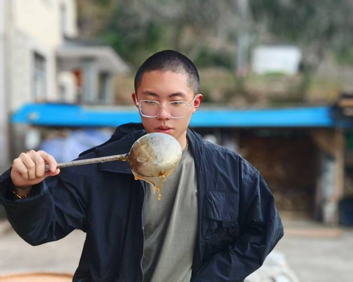 腊月廿八,杭州富阳区万市镇杨家村,夕阳照亮了一双布满皱纹的手。20岁的大学生小郭屏住呼吸,将手机镜头对准了正在压制冻米糖的外公。