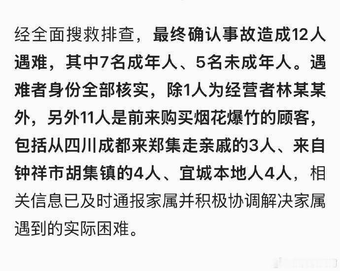 宜城烟花爆燃事故12名遇难者身份核实【宜城烟花爆燃事故应急处置情况通报】遇难12人,11人是顾客,1人是卖家。其中5名还是未成年人。包括从四川成都来郑集走亲戚的3人、来自钟祥市4人、宜城本地人4人。