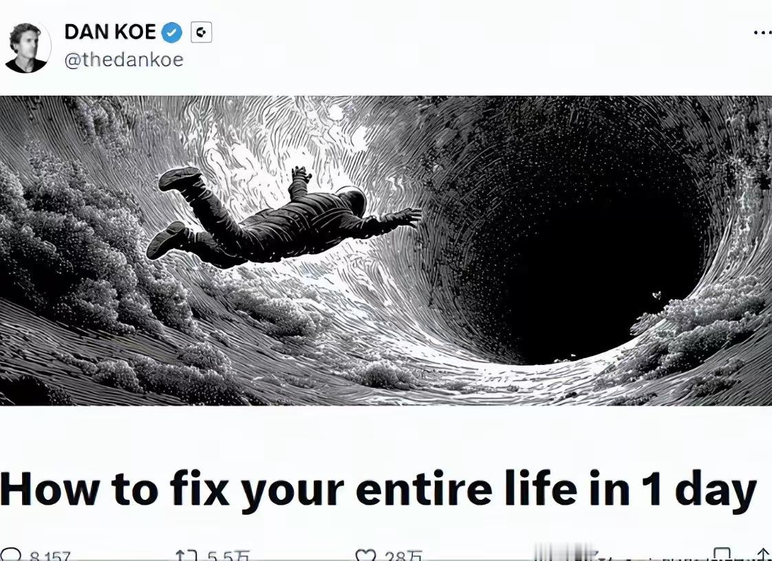 外网炸了!Dan Koe一篇万字长文狂揽1.7亿阅读,全网260万粉丝、年入250万美元的“一人公司”大神,凭一句一天彻底改命收割全世界! 我真的笑麻了。 标题党喊破喉咙,你疯狂转发收藏;大神年入百万刀,你熬夜刷手机到三点。 他说你陷在低能量循环:熬夜→摆烂→焦虑→更熬夜,说得比谁都懂你; 他教你6点起床、调成黑白手机、断社交、整理房间、运动早睡,一套流程走下来,感动自己一整天。 然后呢? 第二天该刷短视频刷短视频,该赖床赖床,该焦虑继续焦虑。 你以为是自己没坚持,其实人家早就算准了,用一天的仪式感,骗你一辈子的焦虑费。 最讽刺的是: 1.7亿人看,1.7亿人收藏,真正改变的不到0.01%。 大神靠“教你改命”赚得盆满钵满,你靠“看改命文”自我麻痹,完美闭环! 他不说“慢慢来”,也不画暴富大饼,就给你伸手就做的小事,让你觉得“我也行”; 他不说一天逆袭,只说“新循环起点”,进可攻退可守,怎么说都对。 真相扎心了: 真正改命的,从来不是一天的自律表演,而是戒掉“总想一天翻盘”的急功近利。 你缺的不是方法,是不指望一天封神的清醒! 别再自欺欺人了! 今天收藏、明天放弃的,年入250万的人教你一天改命,看完你更焦虑了