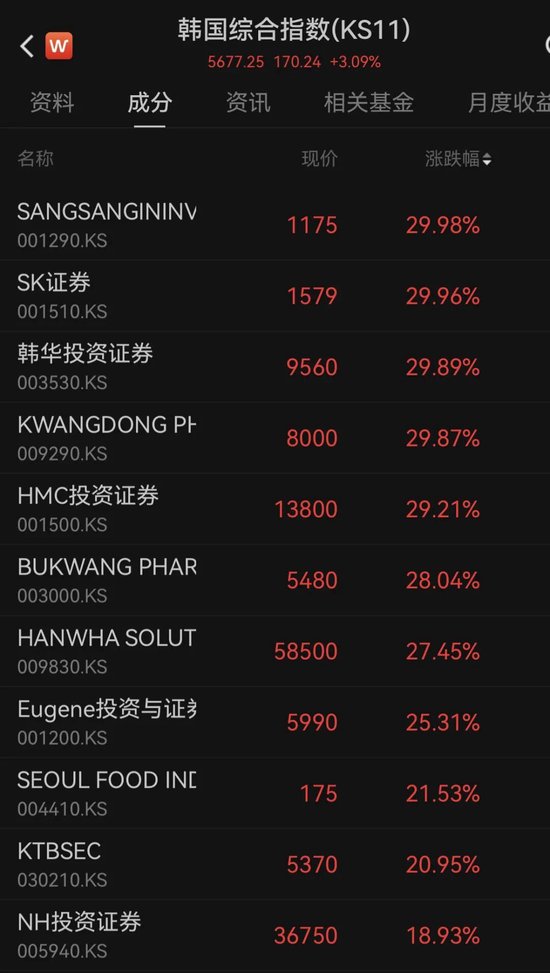 其中,韩国综合指数成份股中,券商股强势爆发,截至收盘,SANGSANGININV&SEC、SK证券、韩华投资证券等30%涨停,HMC投资证券涨超29%,Eugene涨超25%,NH投资证券涨近19%。
