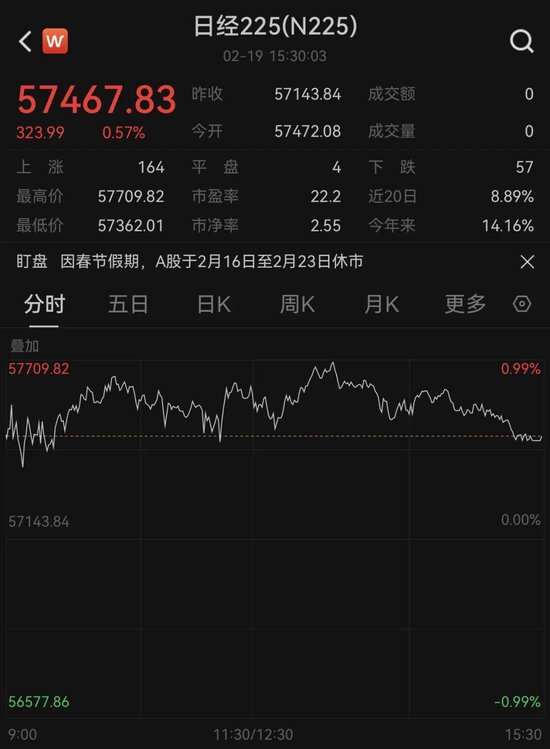 2月19日,日韩股市收涨,截至收盘,日经225指数涨0.57%,报57467.83点;韩国综合指数涨3.09%,报5677.25点,创收盘新高。