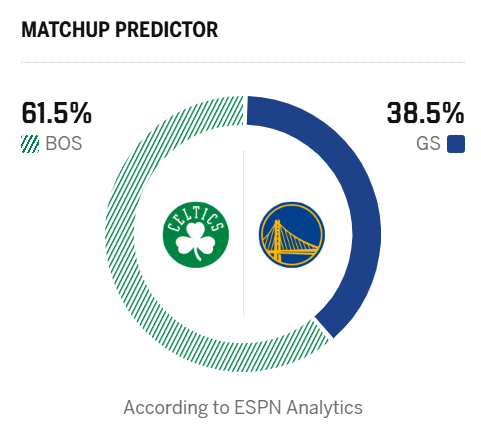 ESPN预测明日比赛:凯尔特人胜率61.5%,勇士胜率38.5%