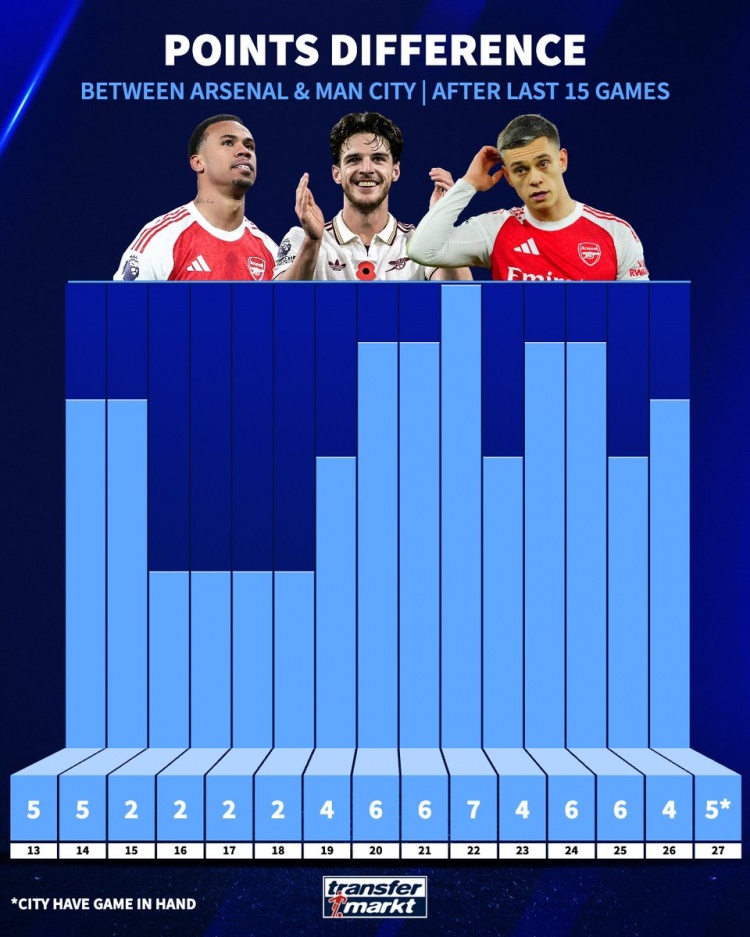 直播吧2月19日讯英超第31轮比赛,阿森纳客场2-2战平狼队。德国转会市场列出表格,盘点了近15场英超比赛阿森纳与曼城的积分差距,阿森纳最多领先7分,而目前多赛1场领先5分。