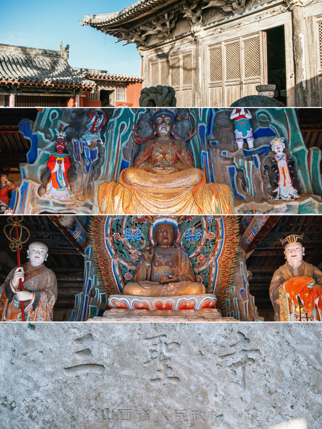 ✔️三圣寺:大雄宝殿为元代木构建筑,地藏殿四壁绘有十殿阎君壁画,背屏彩塑有罕见的西游题材