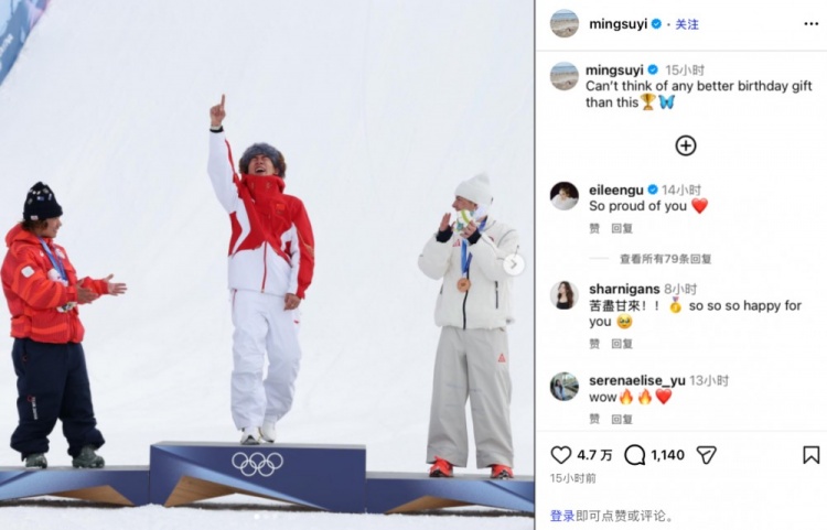 赛后苏翊鸣更新ins,晒出自己在领奖台单手指天的照片,并配文写道:“无法想象还有比这个更棒的生日礼物!”