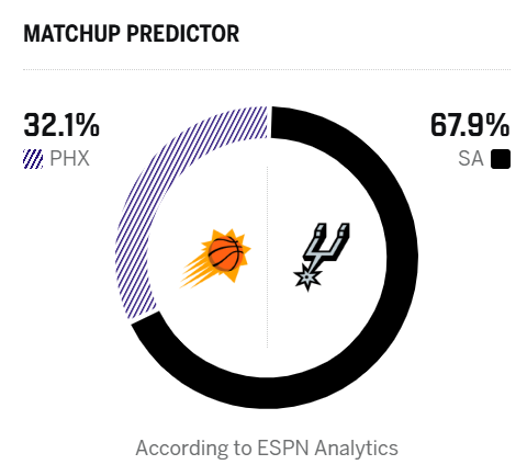 ESPN预测明日比赛:马刺胜率67.9%,太阳胜率32.1%