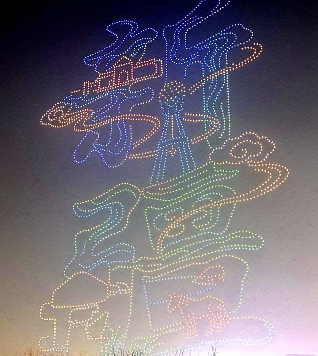 2月18日晚,新疆乌鲁木齐市文化公园光影绚烂。3000架无人机腾空而起,将夜空点亮,组成新疆标志性建筑等造型,不时引来阵阵欢呼。连日来,新疆各地纷纷以无人机表演营造科技年味,喜迎马年,点亮新春。