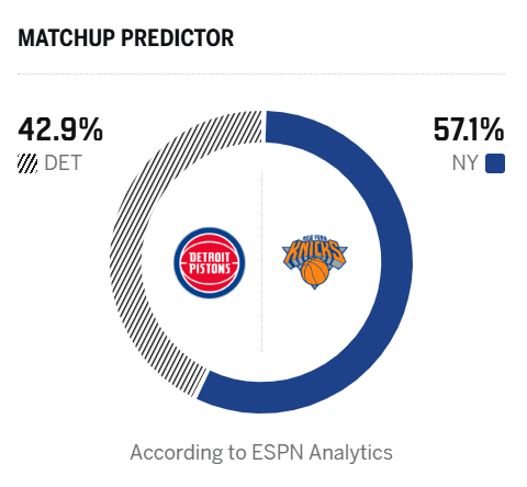 赛前,美媒ESPN预测本场比赛,活塞胜率42.9%,尼克斯胜率57.1%。
