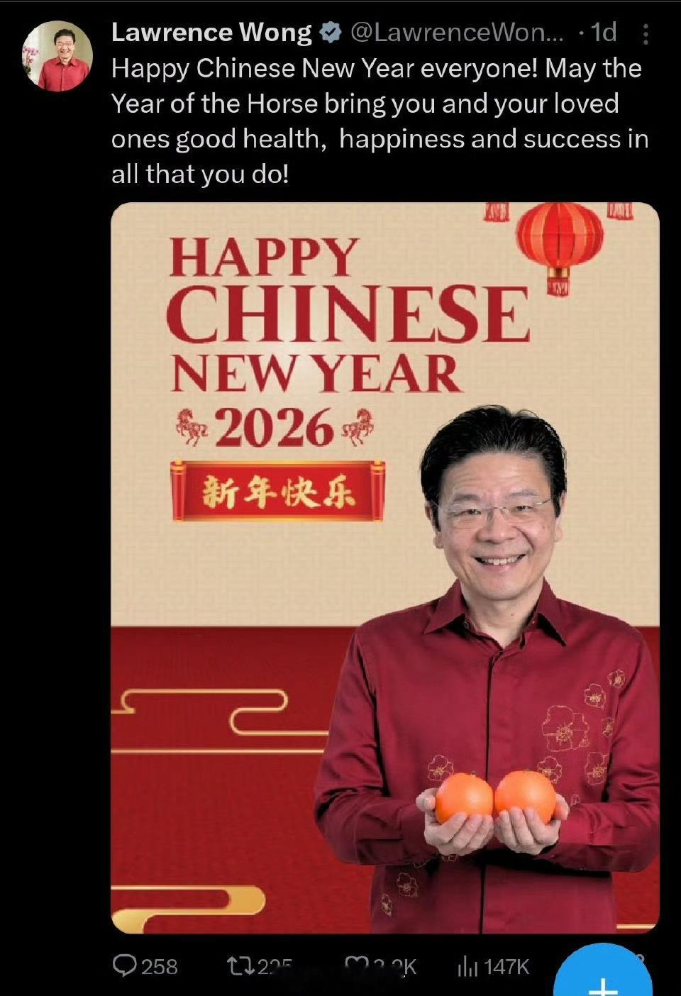 新加坡总理的春节贺词变化:2024年:农历新年快乐!2026年:中国春节快乐!