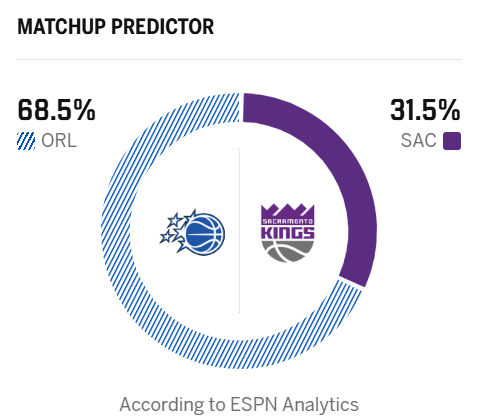 ESPN预测明日比赛:魔术胜率68.5%,国王胜率31.5%