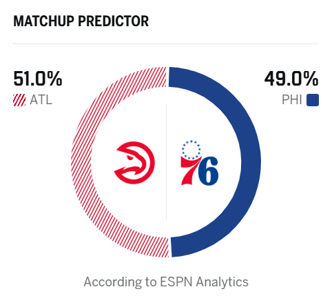 ESPN预测明日比赛:老鹰胜率51.0%,76人胜率49.0%
