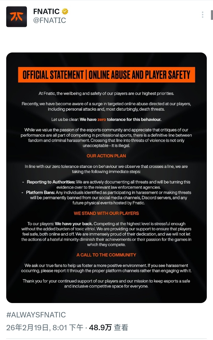 直播吧02月19日讯欧洲LEC赛区FNC俱乐部近期在社媒公布一则声明关于保障选手安全以及对网络暴力与死亡威胁零容忍。