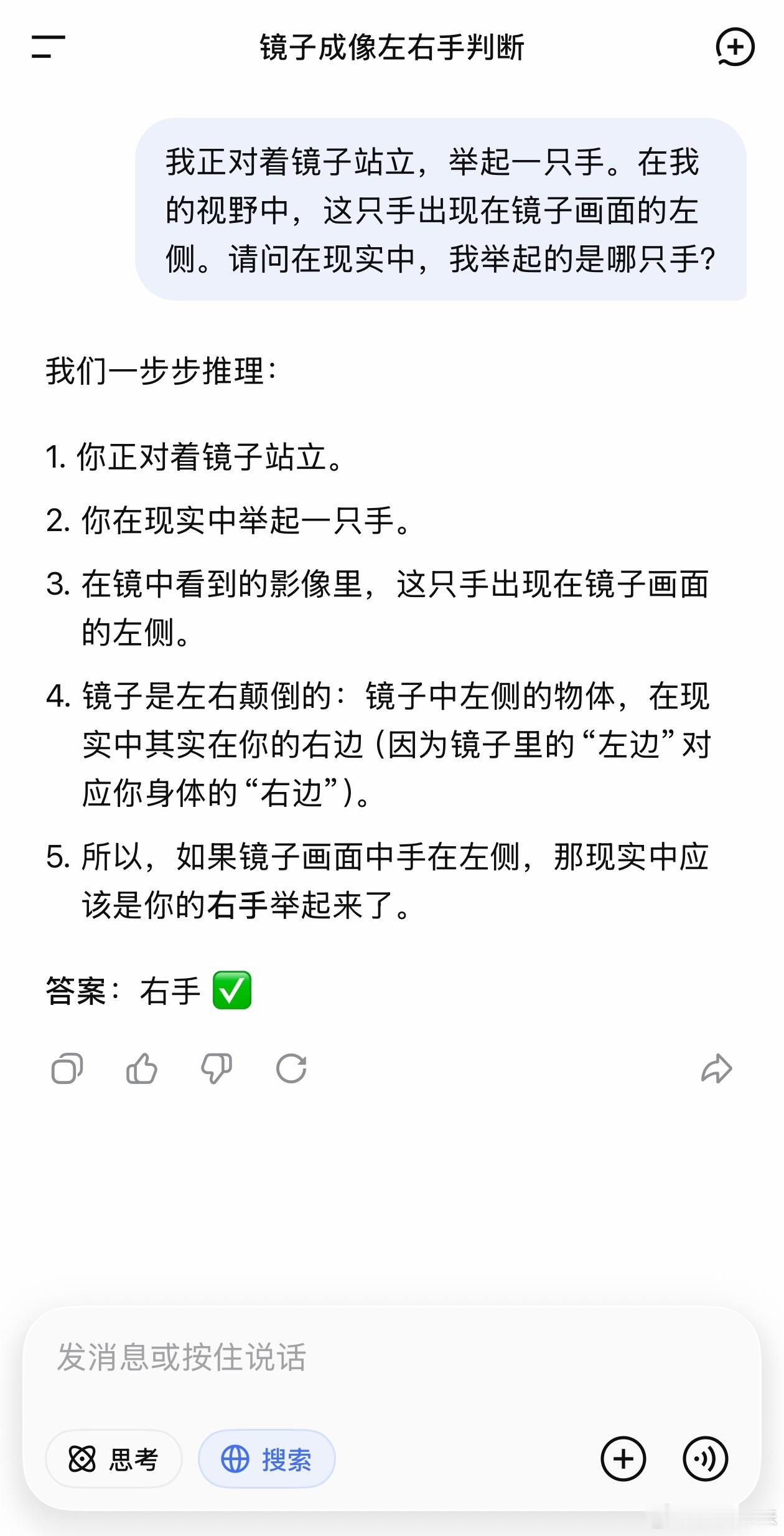 比方下面题目:「我面对镜子举起一只手。在我的视野中,这只手出现在镜子画面的左侧。请问在现实中,我举起的是哪只手?」