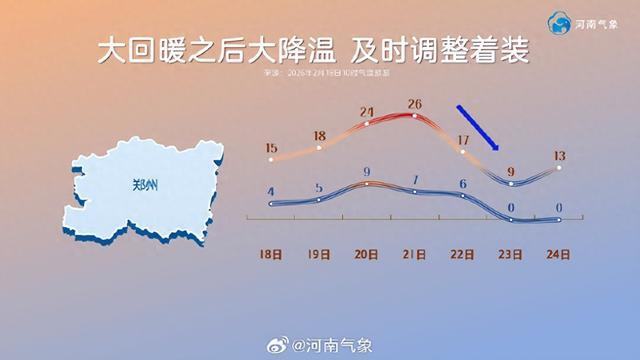 这次降温到底有多猛?我们来看一组数字。以郑州为例,初五的最高温是26℃。到了初七,也就是假期最后一天,最高温会猛降到9℃。