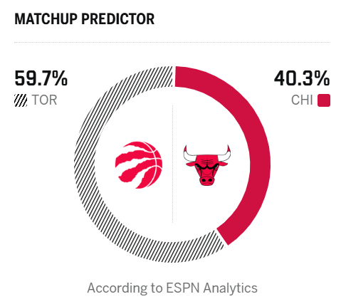 ESPN预测明日比赛:猛龙胜率59.7%,公牛胜率40.3%