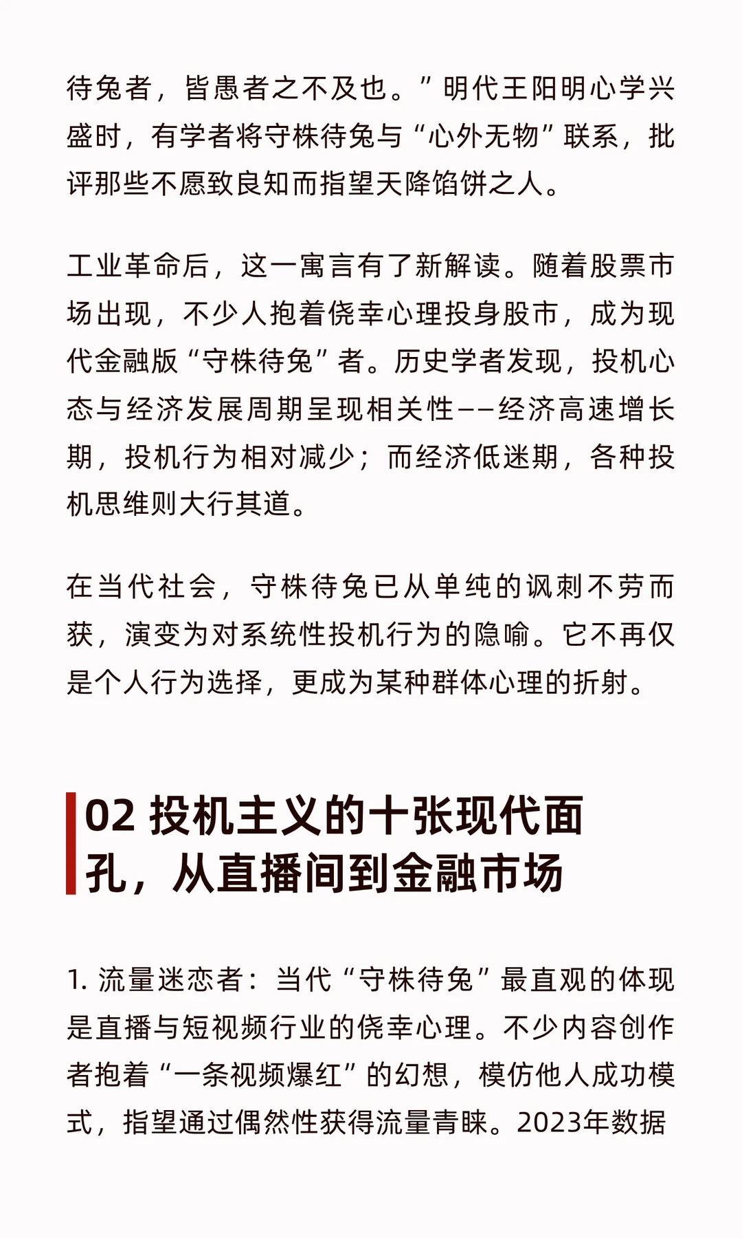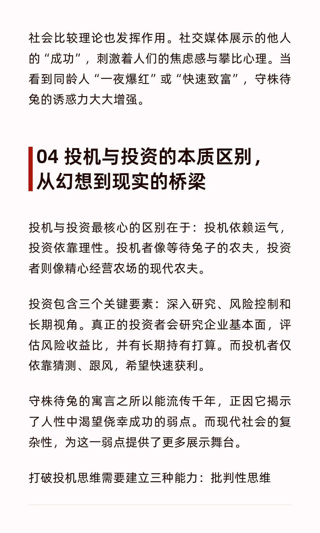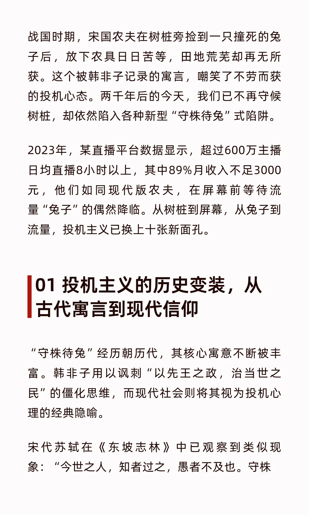 “守株待兔”从古代寓言演变为现代投机心理,体现在直播、股市、教育等领域。投机依赖运气,投资需理性分析。打破投机思维需批判性思维、耐心和系统思考,主动守株待兔才是应对不确定性的正确方式。