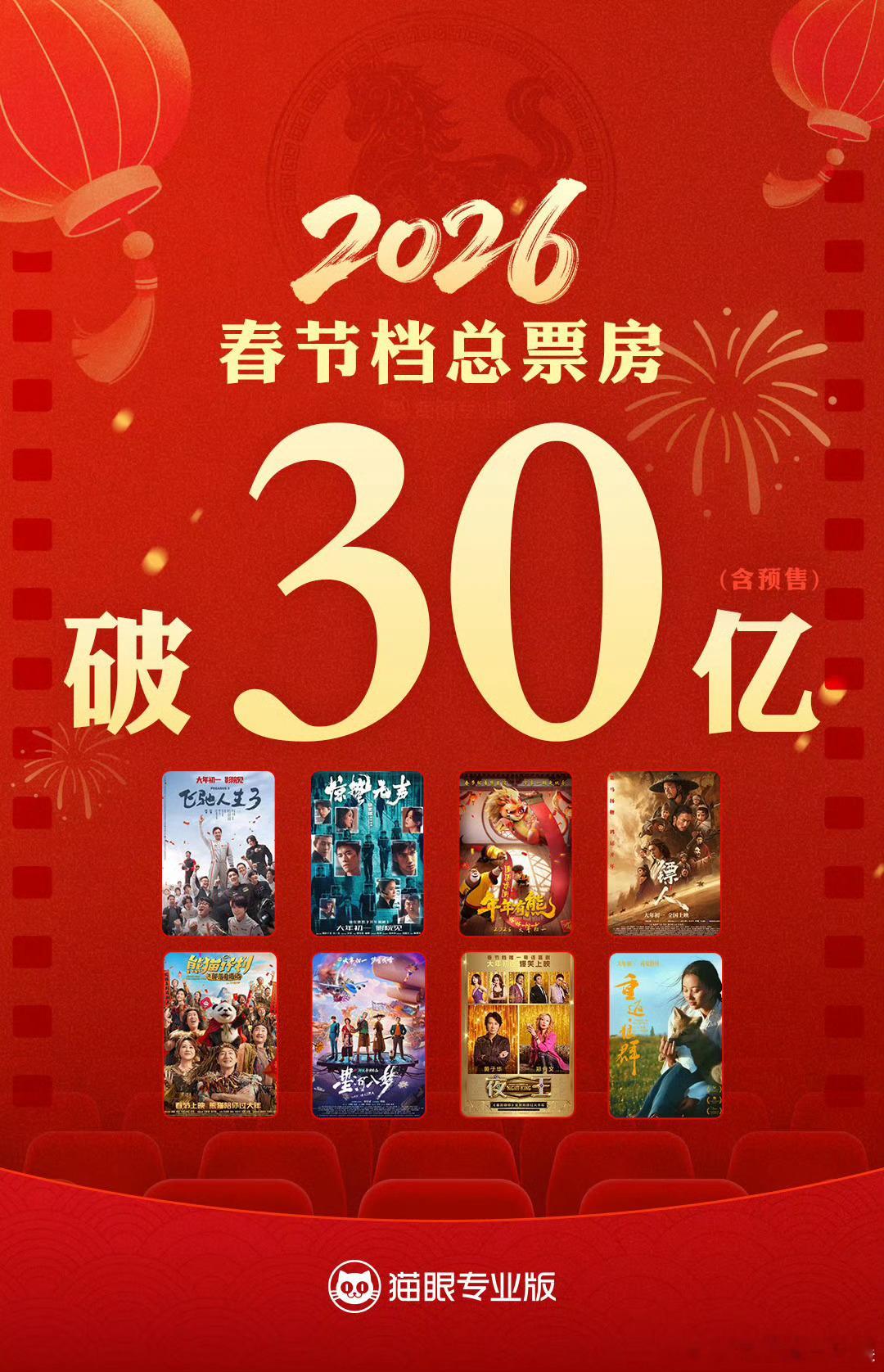 2026春节档票房突破30亿 据猫眼专业版数据,2026年春节档档期总票房(含预