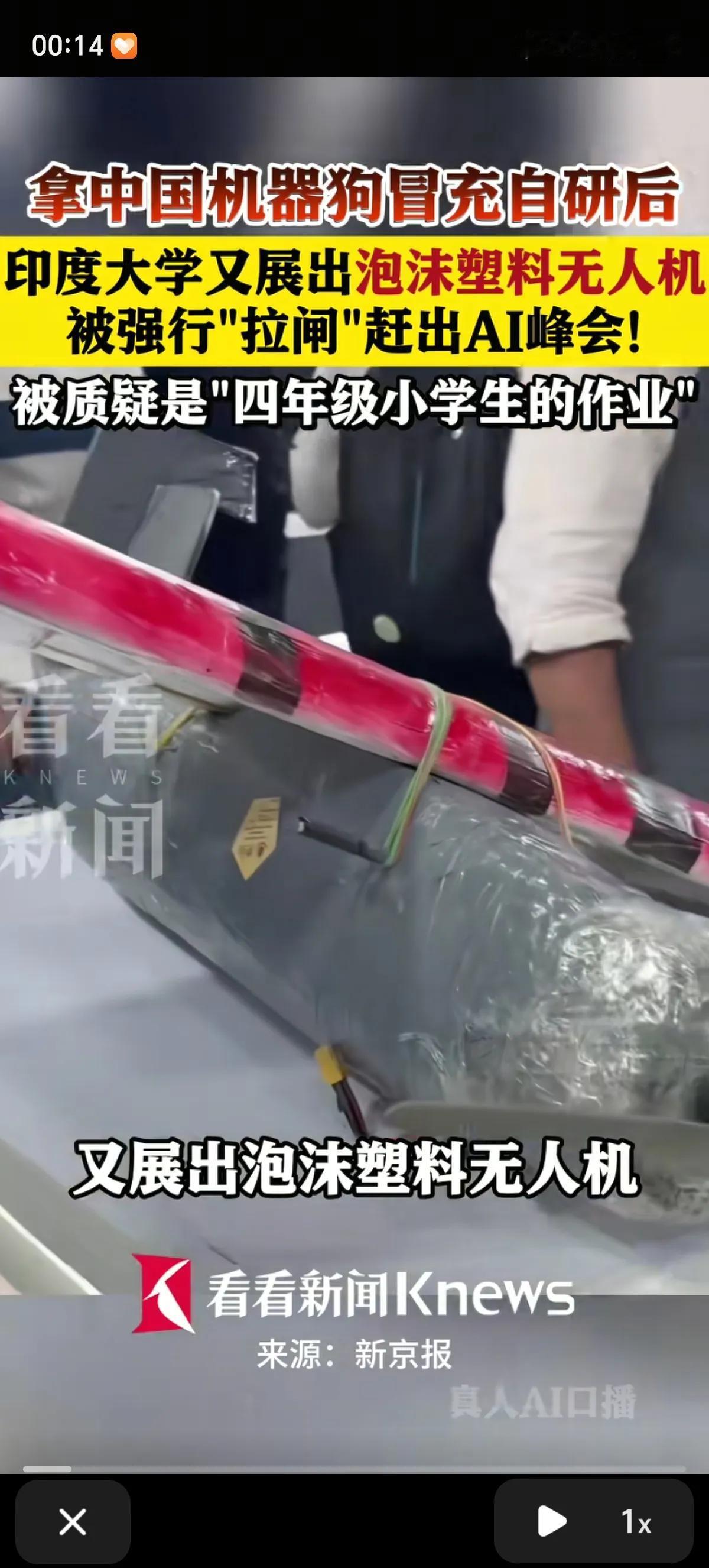 印度大学用中国宇树的机器狗冒充自己研发的后,又拿出了泡沫塑料无人机,做工十分粗糙,被强行“拉闸”赶出了AI峰会。有印度记者质疑“这是四年级小学生的科技作业吗?” 印度加尔戈蒂亚斯大学的传播学教授妮哈·辛格在峰会上,将一台从中国宇树科技采购的Unitree Go2机器狗,改名为“Orion”,宣称是该校“自主研发”的AI成果。 被眼力好的网友发现这台机器狗的外观、电机布局、传感器位置,都和中国量产的Unitree Go2完全一致,甚至连螺丝孔都没改。被揭穿后才承认设备来自中国,却声称是研发探索。 在机器狗造的事情过后,该校又急于“挽尊”,在同一峰会上推出一款“全自主研发无人机。 “无人机”的制作材料极其简陋:机身是泡沫板拼接,表面裹着锡纸模仿金属质感,接缝处用透明胶带和热熔胶固定,所谓“动力系统”只是一个手机充电器改装的电机,连螺旋桨都是塑料片剪的。 既没有飞控系统、传感器等核心部件,也没有任何飞行测试数据,根本无法正常飞行。印度记者当场怒斥:“这是四年级小学生的科技作业吗?” 印度网民有人嘲讽“这泡沫飞机连我家孩子都能做”,甚至要求撤销该大学的办学资格。 AI峰会主办方(印度电子部)最终切断了该校展位的电源,在对方拒绝撤离后,强制拆除了展位。