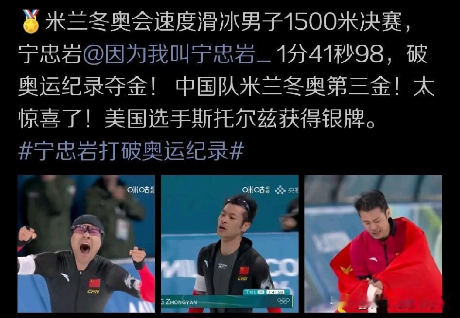 米兰冬奥会的赛场上,男子速度滑冰的比拼当中,显然宁忠岩成为了当之无愧的主角。他也帮助中国队拼下本届奥运会的第三金!!! 因为宁忠岩已经在前面参加的两项比赛,也就是男子1000米的比拼,还有团体追逐赛的较量当中两度登上季军领奖台,也就是收获两枚铜牌,成为中国速度滑冰在米兰冬奥会上舞台上闪亮的明星。而且在他的主项男子1500米的比拼当中也是展现强大竞争力,让我们见证了真正的中国速度,成为更强大的自己,不但以1分41秒98的成绩锁定最后的冠军,而且还实现了打破奥运记录的奇迹,打破1分42秒大关的成绩也确实让人激动和兴奋! 可以说,宁忠岩也用自己赛场上的表现证明着自己的实力,并向我们展现着中国速度滑冰的实力。甚至前面的两枚铜牌也成为一种铺垫,助力宁忠岩不但直接超越所有前面出场的对手,还让在他之后出场的运动员全部没能超越他的成绩,他也从上届奥运会的第七名成绩提升到了冠军的位置! 让我们再次恭喜宁忠岩,也恭喜中国速度滑冰队。从某种角度上来说,以前的短道速滑是中国冬季项目的王牌,但目前这个大项成绩大幅下滑。而当初偶有亮点的中国速度滑冰队则是东方不亮西方亮,给我们带来不一样的精彩,宁忠岩也用自己的成绩打破了欧美运动员在男子1500米项目金牌榜上的垄断。他更是成为这种创纪录的舞台上最闪亮的明星!成就中国速滑新历史的同时,也成就了亚洲运动员的新历史和新突破! 期待着这样的一个宁忠岩单届奥运会一金两铜的成绩,给更多国人带来开心快乐和骄傲!升国旗奏国歌的环节,还有赛后采访环节,他不但激动的哭了还用不可思议四个字来形容自己的表现!他配得上我们一切热烈的祝福和掌声!不是吗?
