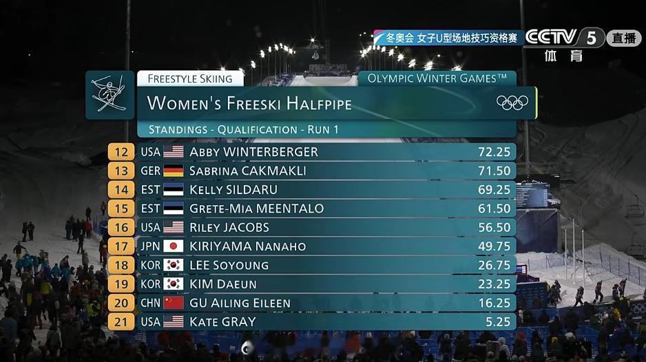 谷爱凌U池首轮摔倒米兰冬奥会自由式滑雪女子U型场地预赛第一轮结束,谷爱凌暂列第2