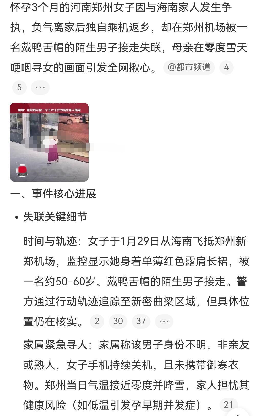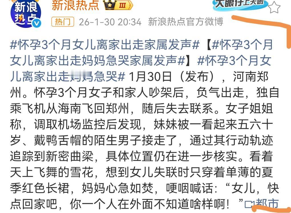 真是太让人担心了,因为和家人发生矛盾, 近日,怀孕3个月女儿离家出走。 女子姐姐称妹妹被一个五六十岁的男人接走了。 这男人到底是这女人的什么人? 这名孕妇也是够任性的。 这么让家人担心。 女子的手机持续关机,希望不要有什么意外。 一定要尽快找到那个男人。