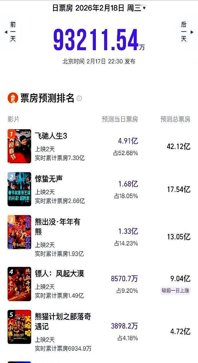 春节档彻底杀疯了,沈腾3天卷走13个亿,成龙大哥的新片连他的零头都摸不到。 不到30%的排片,硬生生抢走大盘一半的钱。你走进影院,十个厅里至少四个在放沈腾踩死油门,在戈壁悬崖上跟人玩命缠斗,观众一边尖叫一边掏钱。 另一边,成龙大哥还在抱着熊猫讲“大声说爱”,排片被挤到不足10%,票房吭哧吭哧3天才破1亿。真不是大哥不努力,是这届观众的口味,彻底变了。 所以你看,现在的春节档已经不是合家欢的温床,而是生死局的修罗场。观众掏钱,不是看你明星阵容有多亮,而是看你故事讲得有多亡命。