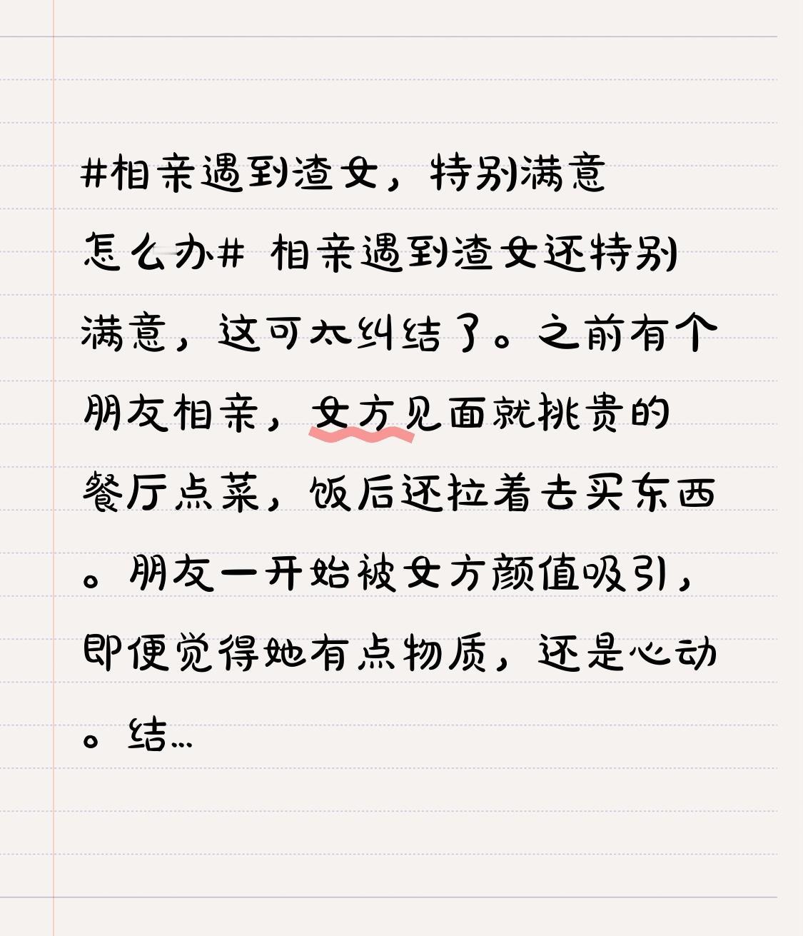 相亲遇到渣女还特别满意,这可太纠结了。之前有个朋友相亲,女方见面就挑贵的餐厅点菜,饭后还拉着去买东西。朋友一开始被女方颜值吸引,即便觉得她有点物质,还是心动。结果女方拿了东西就说不合适,把朋友气得够呛。 渣女可能外表、谈吐很有吸引力,但相处久了,那些只为利益的行为就会暴露。就像参考里那女孩,饭后买益力多还果断拒绝,明显是算计好的。遇到这种情况,即便满意也得理智,别被一时好感冲昏头脑,不然最后受伤的还是自己。