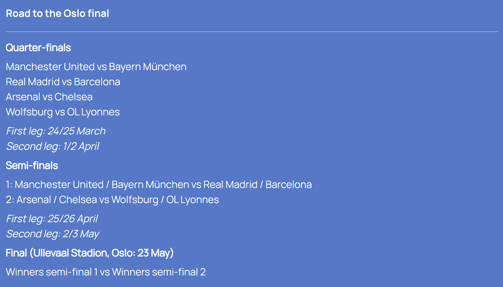 最终决赛将于5月23日在奥斯陆乌勒瓦尔体育场打响,届时两场半决赛的胜者将争夺本赛季女足欧冠冠军。