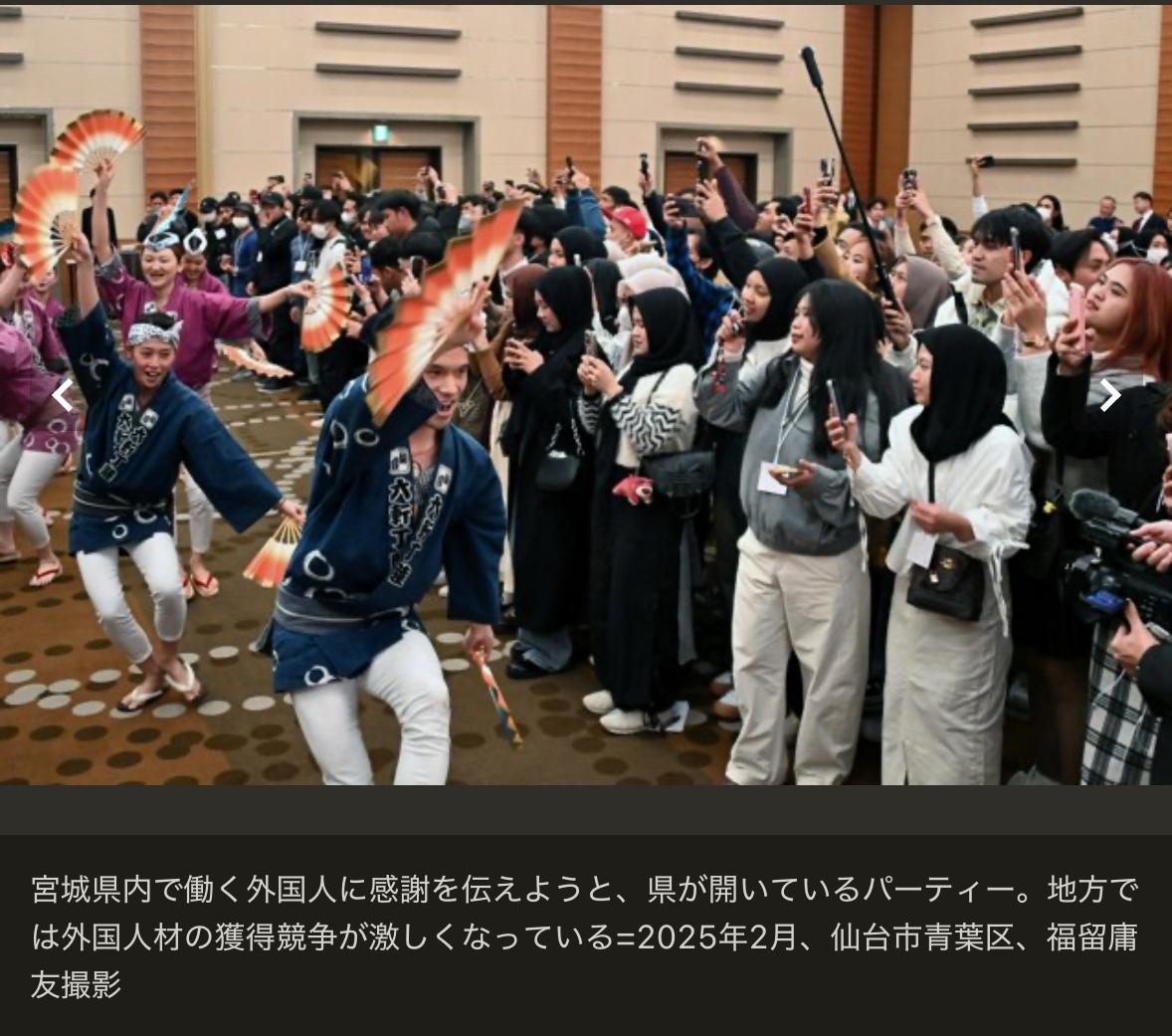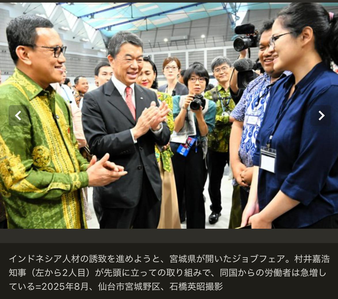 据日本宫城县劳动局汇总数据显示,截至去年10月底,宫城县内外国劳动者人数为2万234人,创下历史新高。不过,同比增长率仅为3.5%,新冠疫情过后持续的激增势头明显放缓。主要原因是此前占主力的越南籍、尼泊尔籍劳动者人数减少。 宫城县外国劳动者人数变动情况: • 2021年:减少2.8% • 2022年:增加10.2% • 2023年:增加12.2% • 2024年:增加17.9% 日本全国截至2025年10月底的外国劳动者总数约为257万人,同比增长11.7%;东北其他各县的增长率也在7%~12%区间。 宫城县3.5%的增速在全国仅高于滋贺县的2.7%,增长放缓态势十分突出。 按在留资格划分: • 专业、技术领域在留资格人数最多,达5915人,同比增长22.7% 其中特定技能资格2652人,大幅增长48.5% • 技能实习5684人,增长1.9% • 留学生打工等资格外活动5508人,减少8.8% 由此可见,人才正从技能实习生、留学生,向拥有一定技能、且有望获得永住资格的特定技能外国人转移。 按国籍划分: • 越南籍:4312人,减少11.5% • 尼泊尔籍:3236人,减少6.0% 两者均因留学生人数大幅减少所致。 • 印度尼西亚籍位列第三:2908人,增长31.8% 这是宫城县在2024、2025年连续举办招聘会、积极引进该国劳动力所取得的成果。 对于县内越南、尼泊尔劳动者减少的现象: 仙台越南人协会代表杜文俊(ド・ヴァン・トゥアン)表示:“越南国内经济在增长,而日本因日元贬值,打工赚钱的吸引力正在下降。” 居住在仙台的海外尼泊尔人协会干部吉·桑迪普(ジシ・サンディプ)指出:“尼泊尔留学生在日语熟练之前,大多在食品工厂等地方打工。但这类工厂里的特定技能外国人越来越多,留学生也就更难找到工作了。”