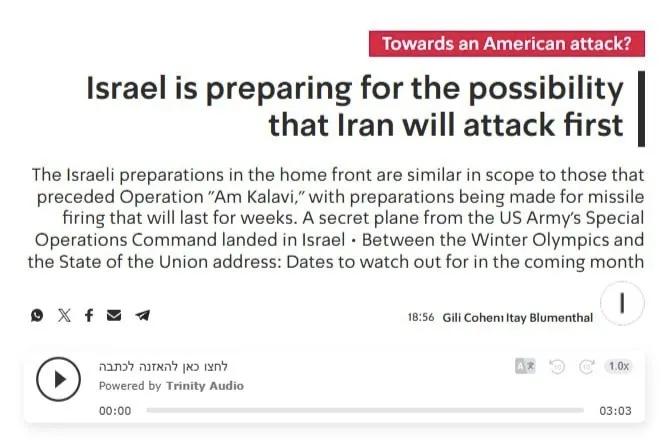 KAN网站报道称,以色列评估认为,伊朗如果察觉到美国或以色列即将发动袭击的迹象,
