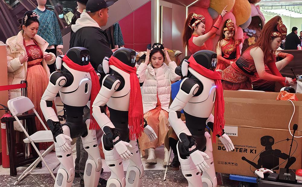2月19日,机器人与演员在后台候场。中国日报记者耿菲菲摄