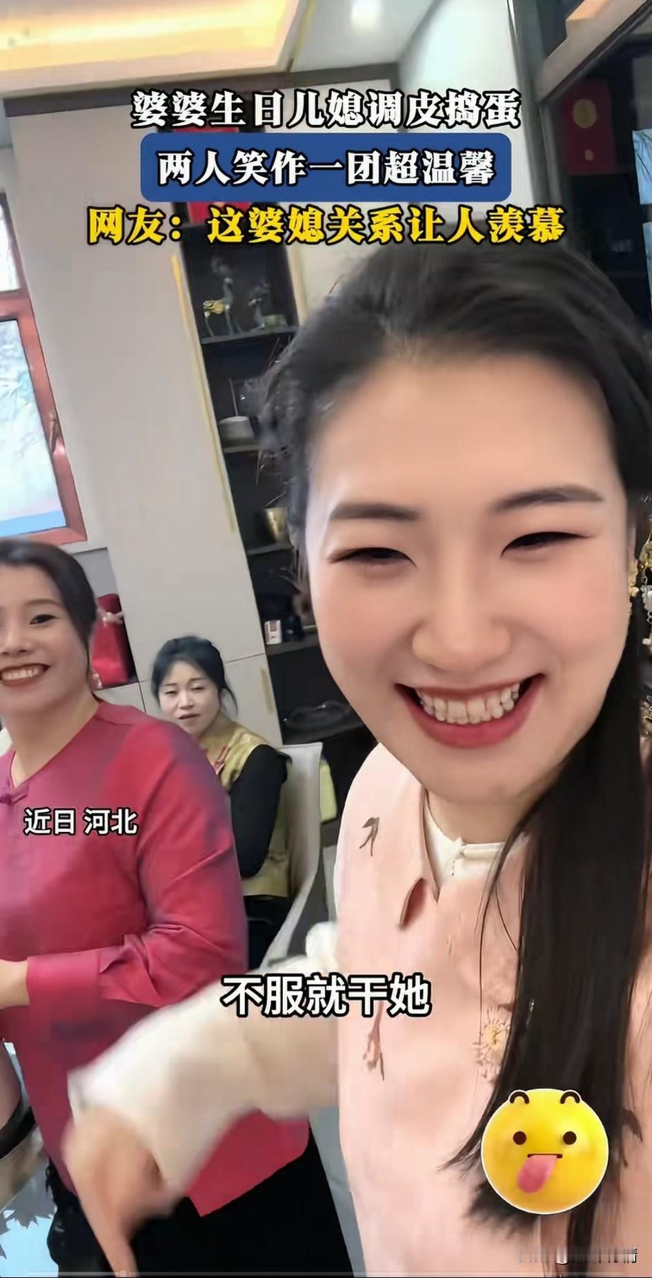 近日,河北婆媳过生日的场面很出名, 女子在婆婆过生日的饭桌上搞怪, 对着自己的婆婆就是一顿说, 这是我的婆婆, 该干的时候咱就得干, 毕竟咱亲妈也会干, 干赢了,当家做主, 干不赢咱就换另一家, 这一番话直接将婆婆给逗笑, 对着她就是一顿爱的抚摸, 旁边的人也都跟着乐乐, 可以看出两个人平时关系处的很好, 这样的婆媳关系不常见, 毕竟现实中的婆媳关系大部分都比较紧张,可以说是谁都看不上谁, 所谓清官难断家务事, 说的就是这事, 毕竟家家有本难念的经, 儿媳妇儿要理解婆婆, 当然婆婆也要理解儿媳妇的难处, 只有双方坦诚相见, 生活才能过得安乐, 如果真像这位儿媳妇儿这样干, 估计过不了多久就要离婚, 毕竟男人比较讨厌家中鸡犬不宁! 大家对于这样的婆媳关系怎么看? 婆媳 婆媳间趣事 婆媳过生日 婆媳搞笑日常 婆媳欢喜过大年 婆媳大赛