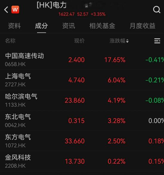 电力设备板块同样表现亮眼。中国高速传动涨逾17%,上海电气涨超6%,哈尔滨电气涨超4%,东北电气涨超3%。