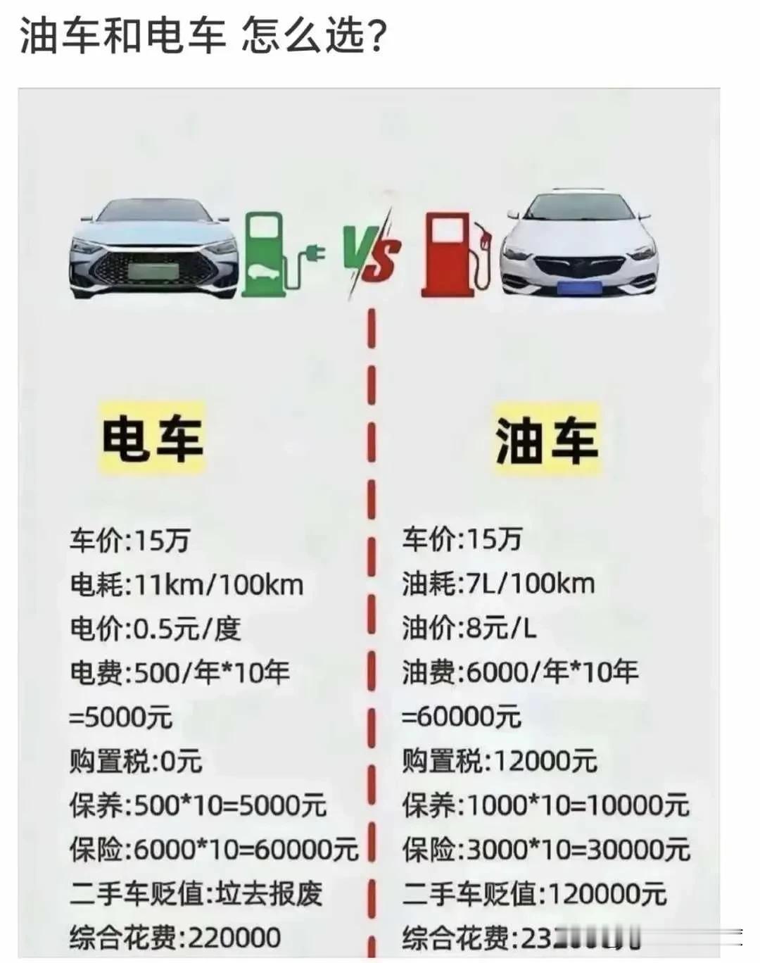 纠正一下图中的几个小问题,电车的实际电耗平均14左右吧,电价平均7毛左右,按我一年两万公里电费大概2000左右,还有电车购置税政策现在是半税,不是全额减免了;油车油耗7个基本差不多,但是现在油价92号基本稳定在7块左右,两万公里油费大概一万,按现在的二手车行情10年后20万公里大概还能有购车价20-30%,也就是3-4万左右。