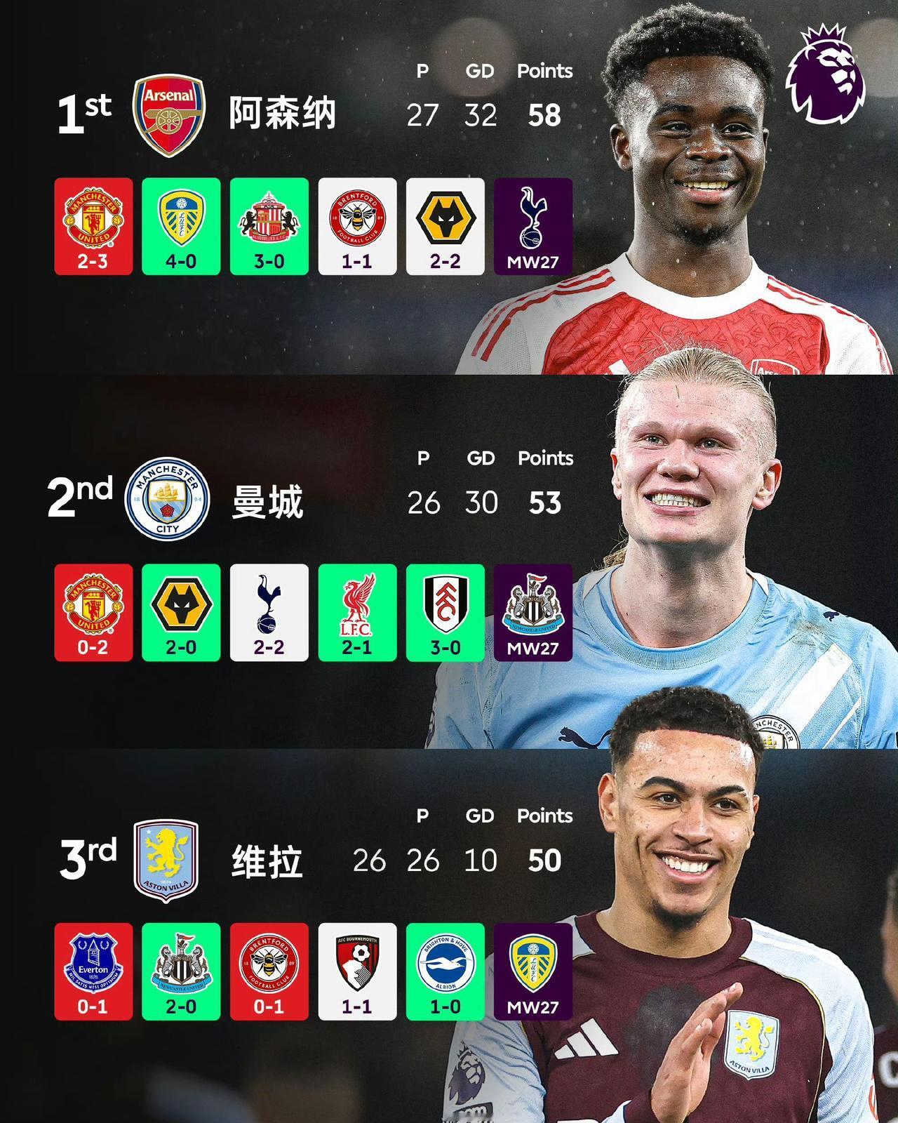 一年一度的争冠游戏白热化了!就看谁掉得更狠。英超积分榜前三名近5场英超战况: 阿森纳:2胜2平1负,丢7分。 曼城:3胜1平1负,丢5分。 维拉:2胜1平2负,丢8分。
