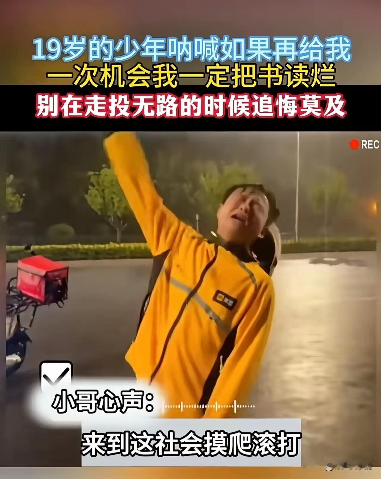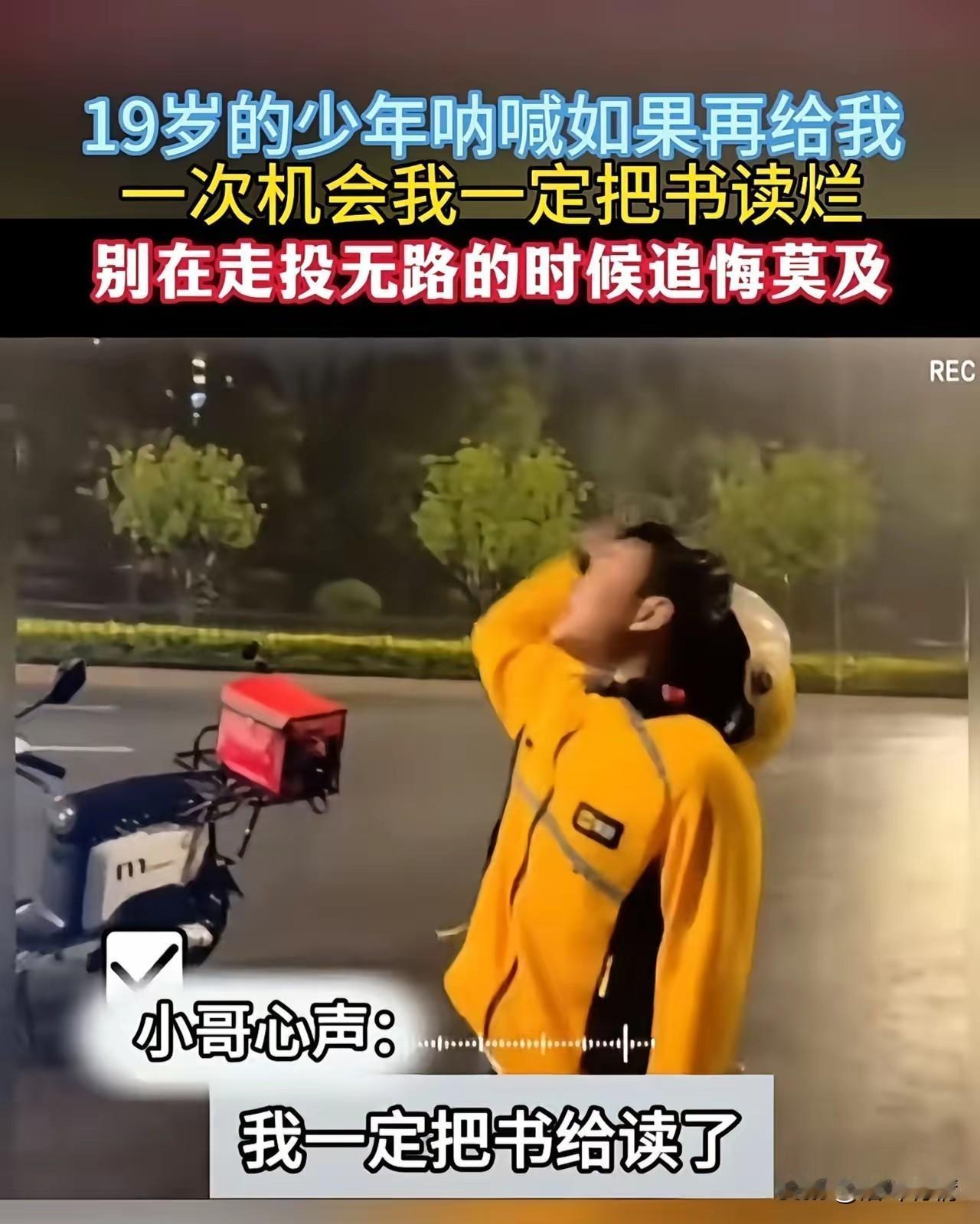 一名快递小哥, 送餐结束后在路上崩溃了, 他大哭着说如果再给他一次机会, 他一定把书读烂了, 这是一个19岁的少年, 在经历了社会的毒打之后, 发出的肺腑之言, 读书的年纪不好好读书, 非要出来社会闯, 如今天天送外卖, 他实在是后悔了, 这还崩溃大哭, 所以说年轻人要好好学习, 不要以后再后悔了, 毕竟一旦出了校园的门, 没有人才会把你当学生看待, 社会就像一个看不见的大丛林, 挣不到钱的绝望,你无法想象, 该学习的时候还是要好好学习, 该工作的时候你也跑不了, 毕竟这个社会就是这样, 大家对于外卖小哥的呐喊怎么看? 外卖哥感动瞬间 外卖小哥 悲伤外卖小哥 快递小哥