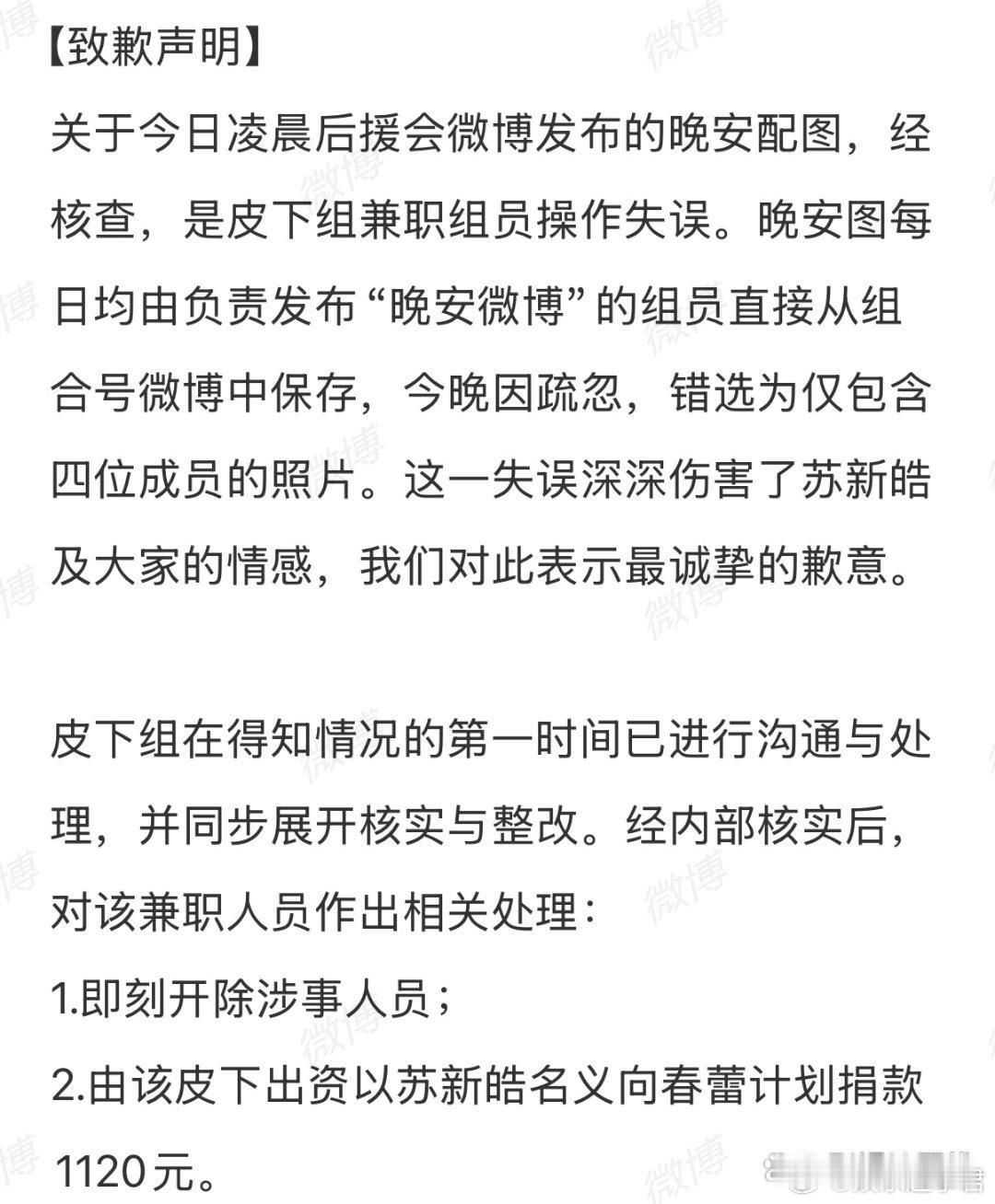 TOP登陆少年官方后援会因发布仅含四位成员的配图,引发粉丝对成员苏新皓被刻意忽略的质疑。20日凌晨发布致歉声明,解释为兼职组员操作失误,日常晚安图直接从组合号保存,此次误选旧图。涉事人员被开除,并以苏新皓名义向“春蕾计划”捐款1120元(对应112天助学金)。