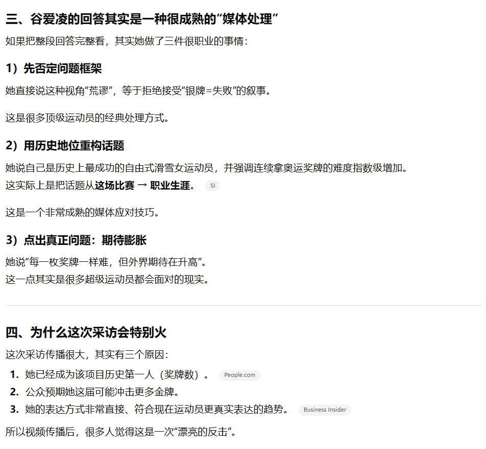 谷爱凌回应:“这种想法很荒谬。我是历史上最成功的自由式滑雪女运动员,我觉得这个事实本身就是答案。赢得奥运奖牌对每位运动员来说都是改变人生的经历。做到五次,难度是指数级增加的。每一枚奖牌对我来说都一样难,但是其他人的期待在升高。所以,‘丢掉两枚金牌’这个视角,坦白说我觉得这种想法很荒谬。我在展现最好的自己,我在做前所未有的事情,这已经足够好了。”